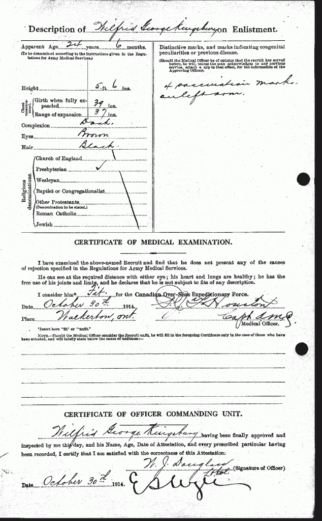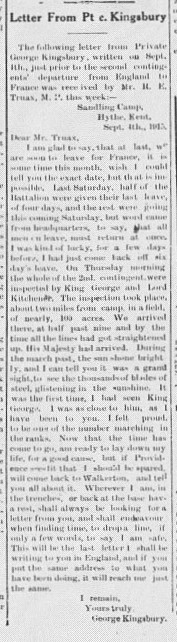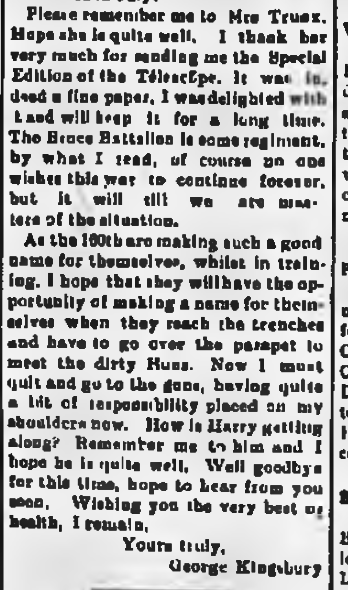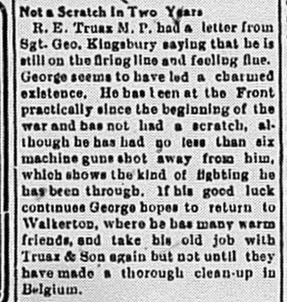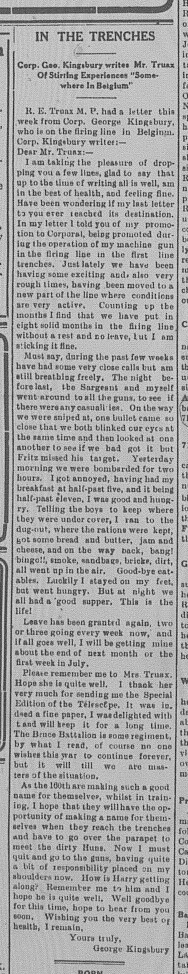 Note: the Walkerton Telescope has 32 name instances for this soldier in its 1914 to 1918 editions. See PDF files and search for Kingsbury.
