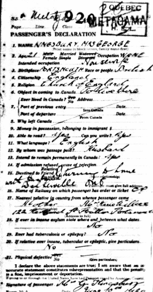 Family Search: When Wilfrid George Kingsbury was born on 8 April 1890, in Portsmouth, Hampshire, England, United Kingdom, his father, Thomas George Kinsbury, was 48 and his mother, Annie Kinsbury, was 40. He married Ivy Wilcox in 1920, in Paddington, London, England, United Kingdom. They were the parents of at least 1 son. He immigrated to Canada in 1913 and lived in Walkerton, Bruce, Ontario, Canada in 1921. He registered for military service in 1914. In 1914, at the age of 24, his occupation is listed as woodworker in Walkerton, Bruce, Ontario, Canada. He died in 1974, at the age of 84, and was buried in Oldcastle, Tecumseh, Essex, Ontario, Canada.MORE