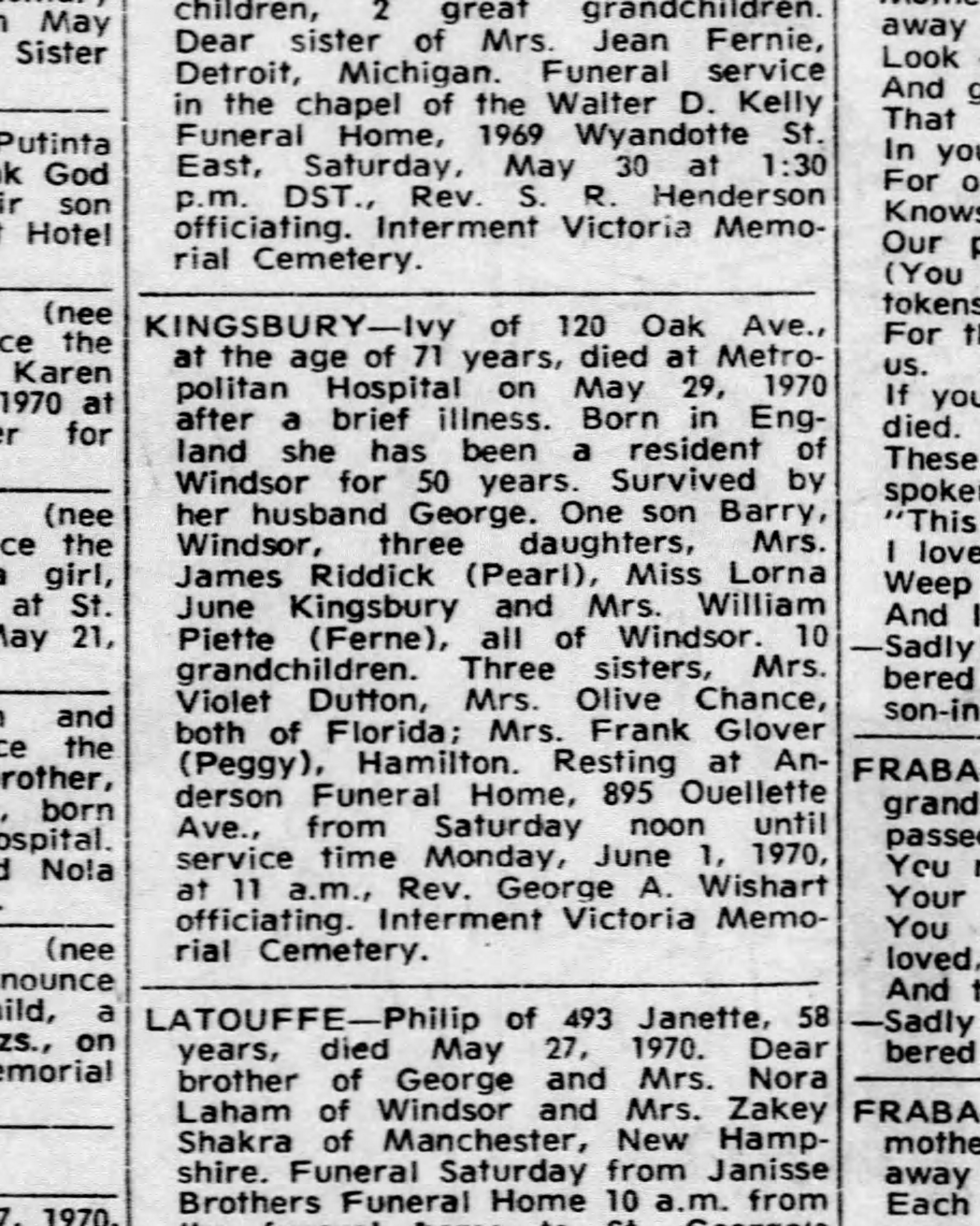 Family Search: When Wilfrid George Kingsbury was born on 8 April 1890, in Portsmouth, Hampshire, England, United Kingdom, his father, Thomas George Kinsbury, was 48 and his mother, Annie Kinsbury, was 40. He married Ivy Wilcox in 1920, in Paddington, London, England, United Kingdom. They were the parents of at least 1 son. He immigrated to Canada in 1913 and lived in Walkerton, Bruce, Ontario, Canada in 1921. He registered for military service in 1914. In 1914, at the age of 24, his occupation is listed as woodworker in Walkerton, Bruce, Ontario, Canada. He died in 1974, at the age of 84, and was buried in Oldcastle, Tecumseh, Essex, Ontario, Canada.MORE