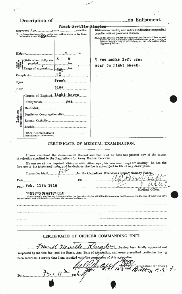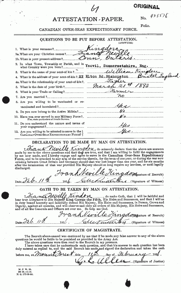 Family Search: When Frank Neville Kingdon was born on 21 March 1893, in Yeovil, Somerset, England, United Kingdom, his father, William Henry Kingdon, was 30 and his mother, Annie Carter, was 23. He immigrated to Canada in 1913 and lived in Conn, Southgate, Grey, Ontario, Canada in 1916. He registered for military service in 1916. In 1916, at the age of 23, his occupation is listed as farmer in Conn, Southgate, Grey, Ontario, Canada. He died on 29 December 1962, in London, Ontario, Canada, at the age of 69, and was buried in Mount Forest Cemetery, Southgate, Grey, Ontario, Canada.
