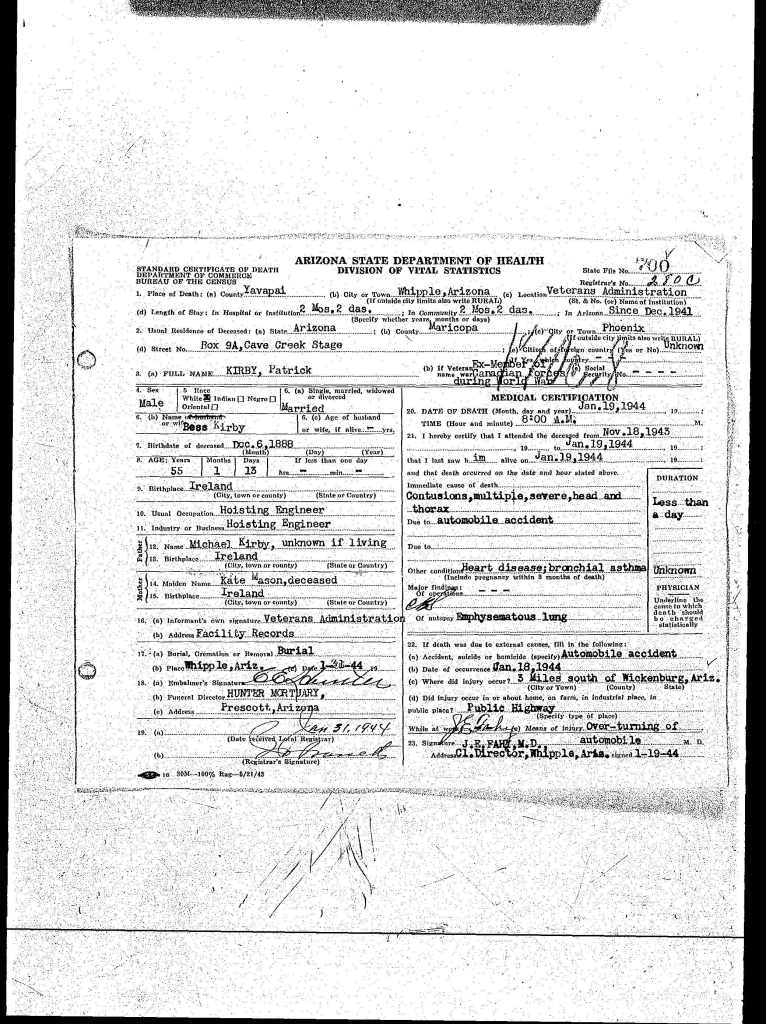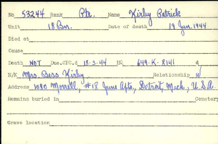 Note that his wife applied for naturalization in the USA and notes this soldier died in 1943 but submitted information to Veterans Affairs that he died in 1944. See attached naturalization record. He was killed in an automobile accident in Arizona.