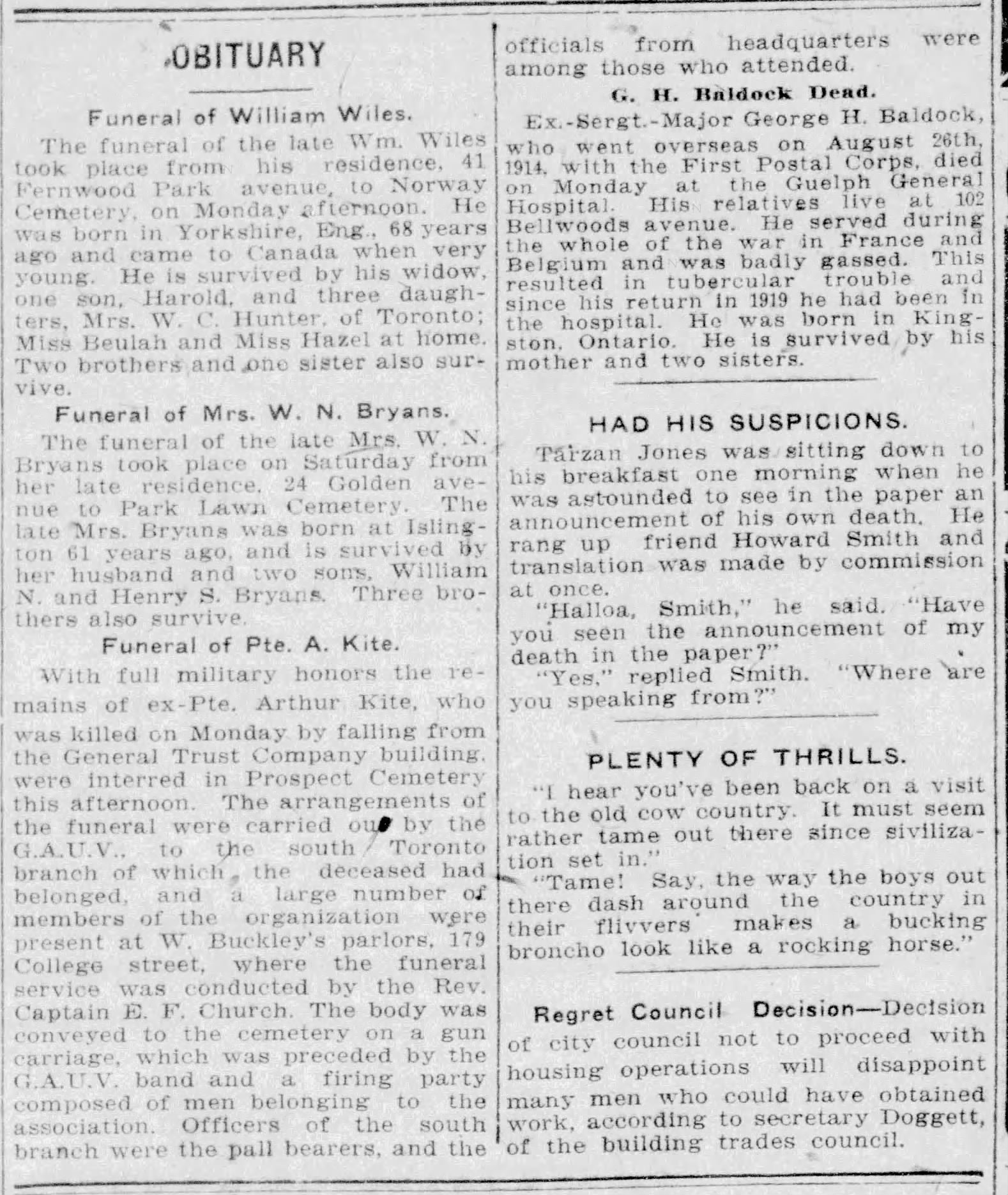 Family Search: When Private Arthur Ernest Hedley Kite was born on 22 May 1882, in Brighton, Sussex, England, United Kingdom, his father, Joseph Thomas Kite, was 27 and his mother, Cordelia Locke, was 31. He immigrated to Halifax, Nova Scotia, Canada in 1919. He registered for military service in 1916. In 1916, at the age of 34, his occupation is listed as hotel porter in Toronto, York, Ontario, Canada. He died on 5 February 1921, in Toronto, York, Ontario, Canada, at the age of 38, and was buried in Prospect Cemetery, Toronto, Ontario, Canada.