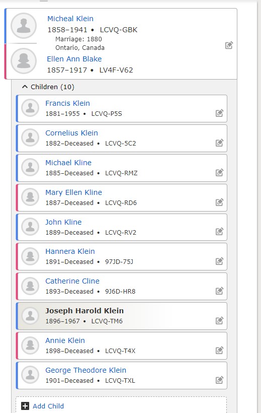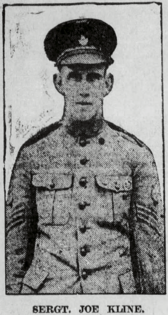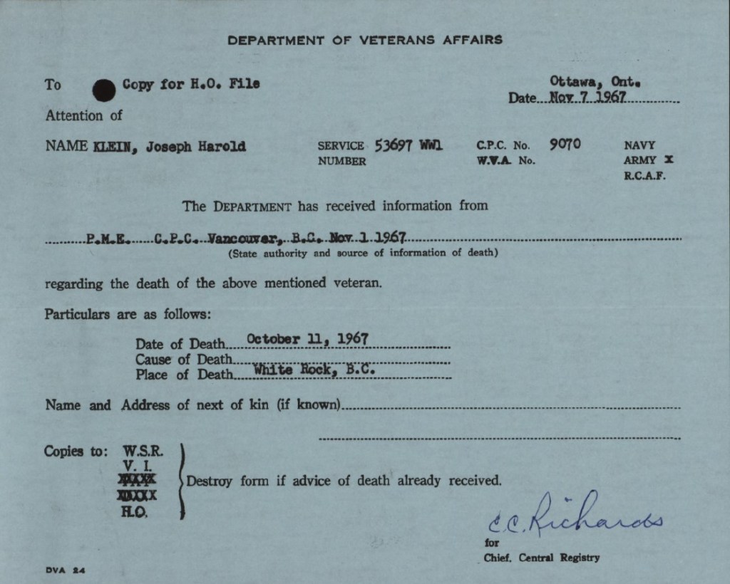 Family Search: When Private Joseph Harold Klein was born on 11 January 1896, in Seaforth, Huron, Ontario, Canada, his father, Michael Klein, was 37 and his mother, Ellen Ann Blake, was 38. He had at least 2 daughters with Violet Vivian Mott. He lived in Peace River, Alberta, Canada in 1926 and Vancouver, British Columbia, Canada in 1931. He registered for military service in 1914. He died on 11 October 1967, in White Rock, British Columbia, Canada, at the age of 71.