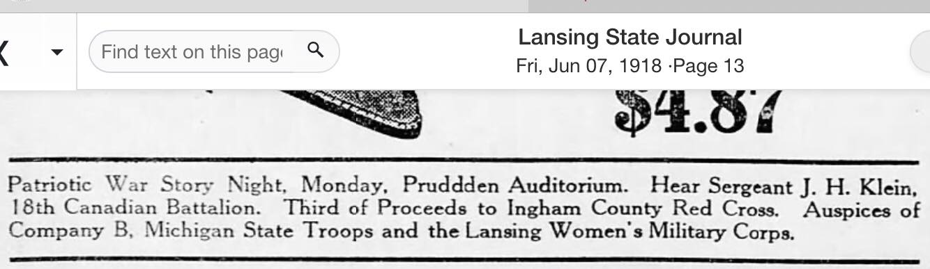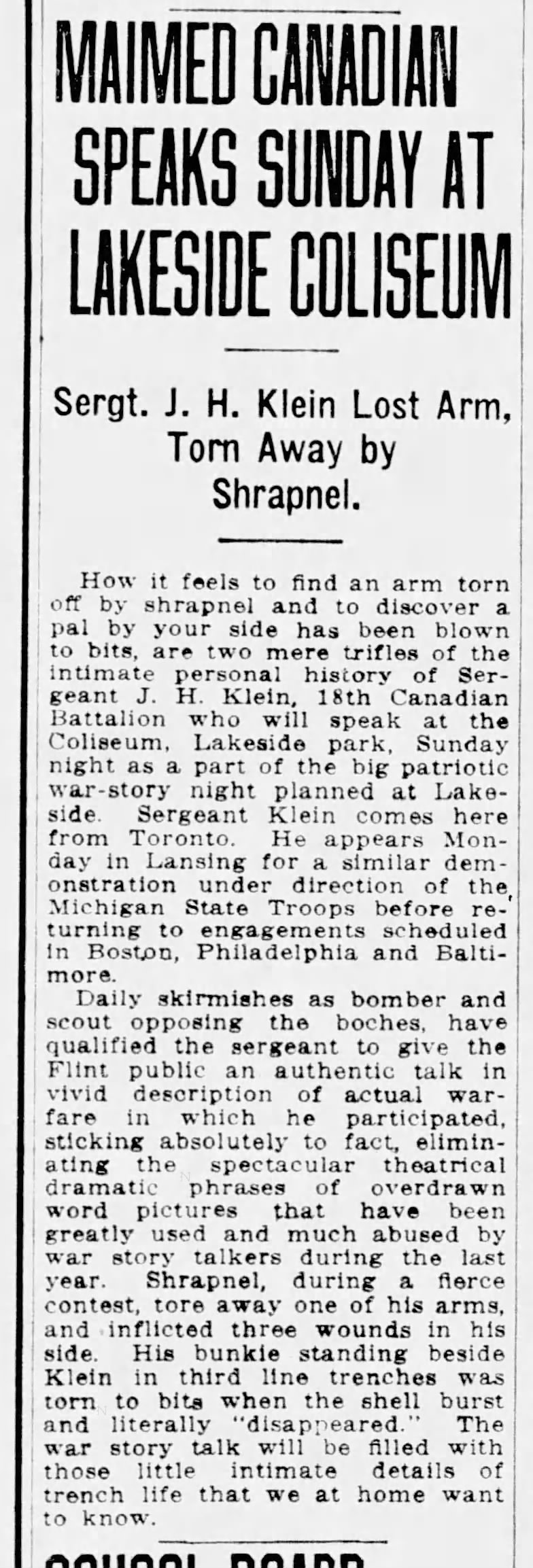 An empty sleeve tells eloquently what Sergeant Klein has sacrificed. Though not yet twenty-two, he served twenty-one months in the Eighteenth Canadian battalion, “Over There” fighting in front-line trenches at Ypres, the Somme, Vimy Ridge, St. Alois and other places. Wounded several times and told by the surgeons that he could not live more than eight months with his wounds, his indomitable fighting spirit has triumphed over physical weakness and he is traveling through America, telling people why they should bend every effort to beat the Hun.