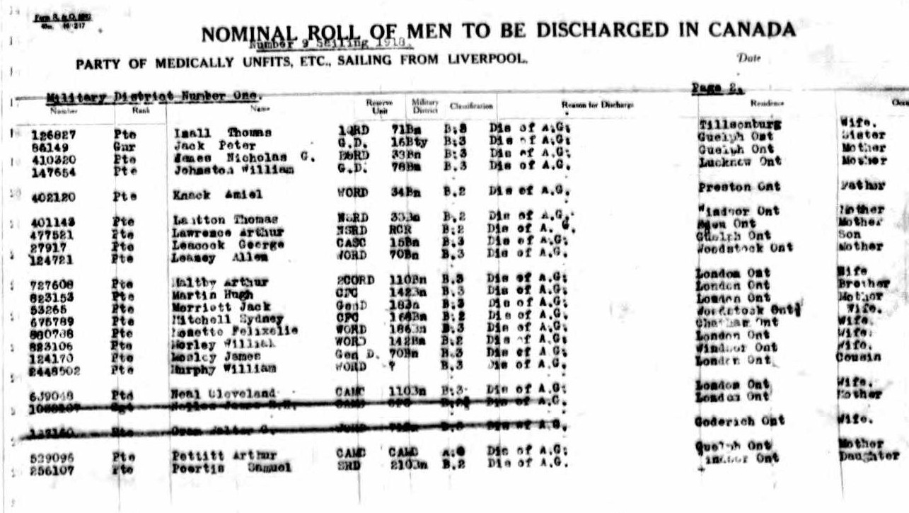 He was discharged as medically unfit for further general service on 12 August 1918, at London, Ontario.