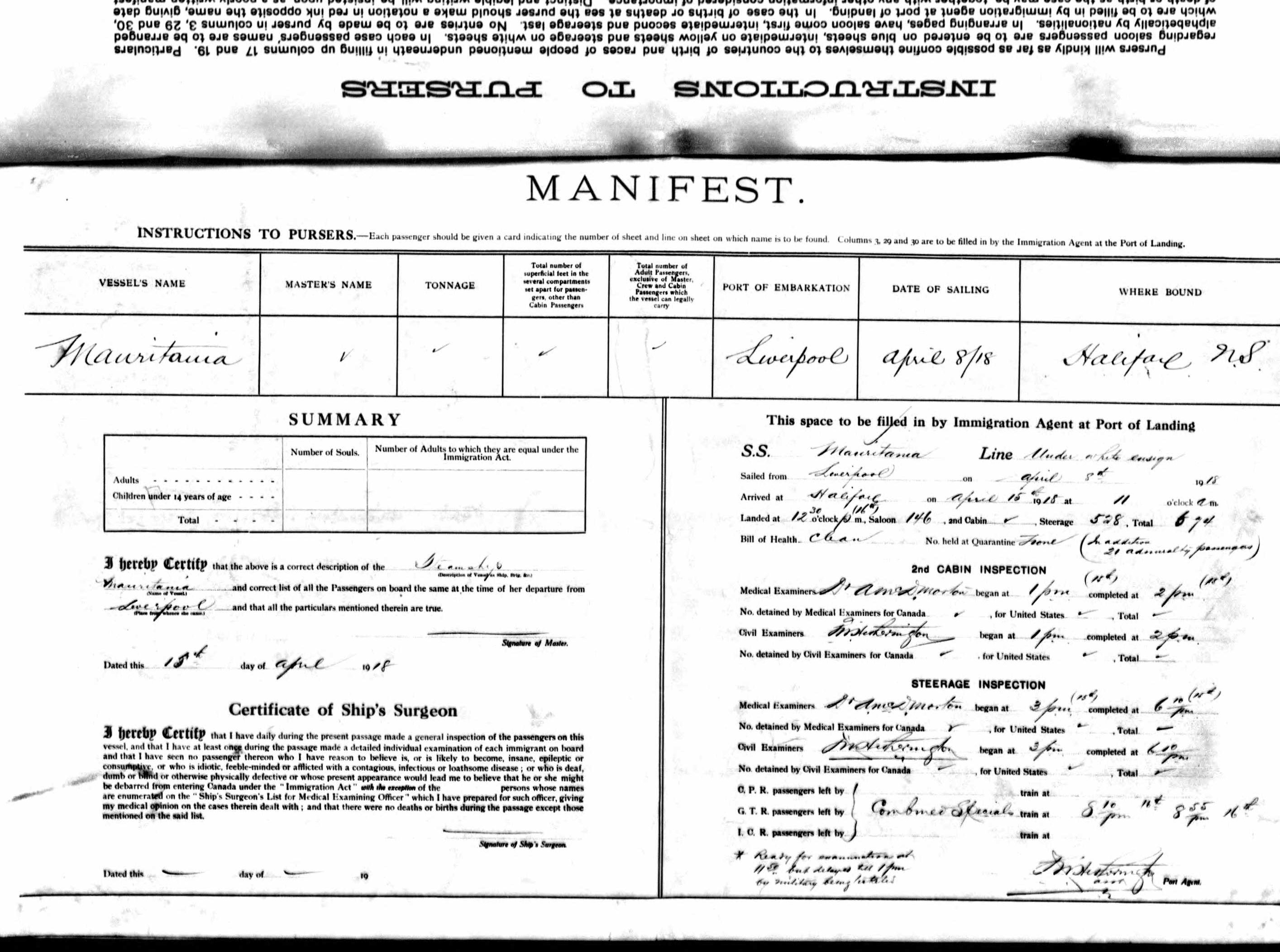 He was medically boarded as “B”2 and was posted to the Western Ontario Regimental Depot for employment. He was returned to the 4th Canadian Reserve Battalion on 31 January 1918 and then was ordered to report to Headquarters on 17 February 1918. It was determined he was to be put “On Command” pending dispatch to Canada and he embarked for Canada from Liverpool in April 1918, arriving at London and Taken on Strength with Military District Depot 1 at London, Ontario.