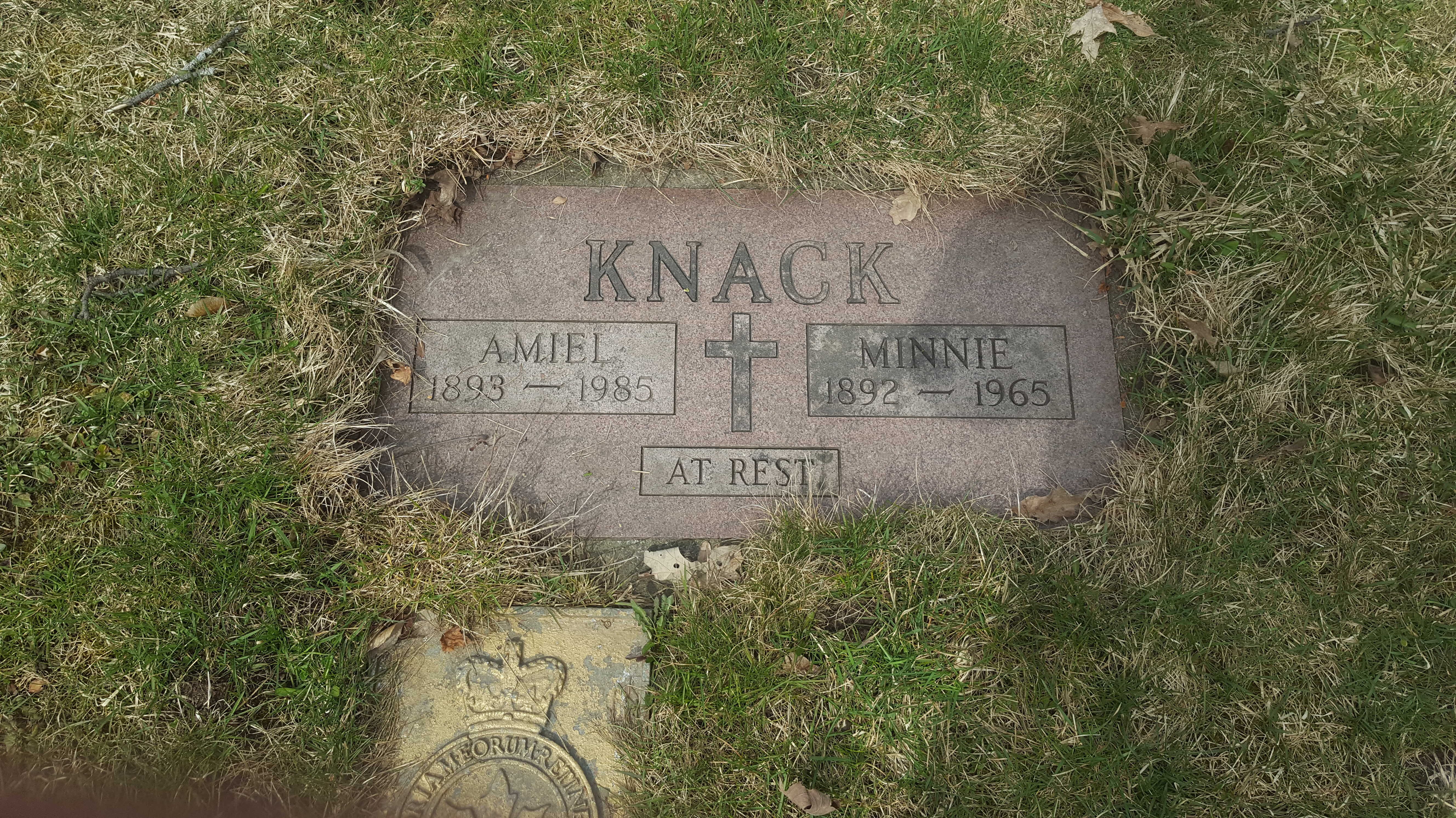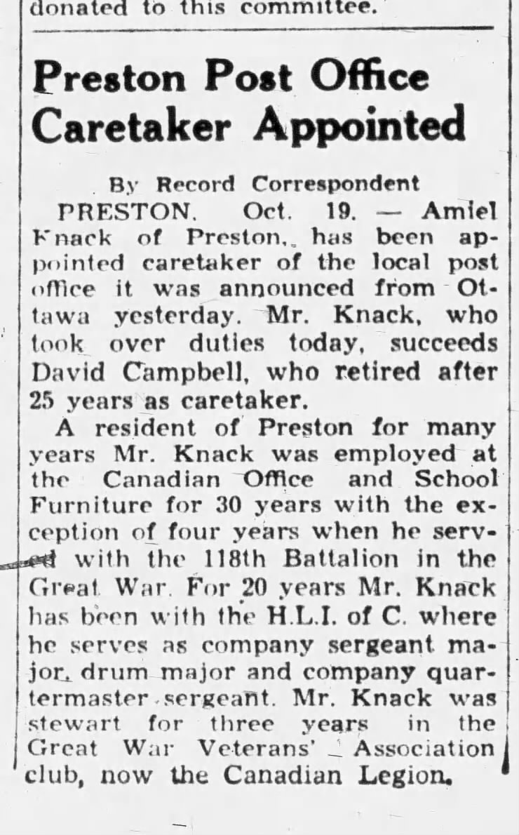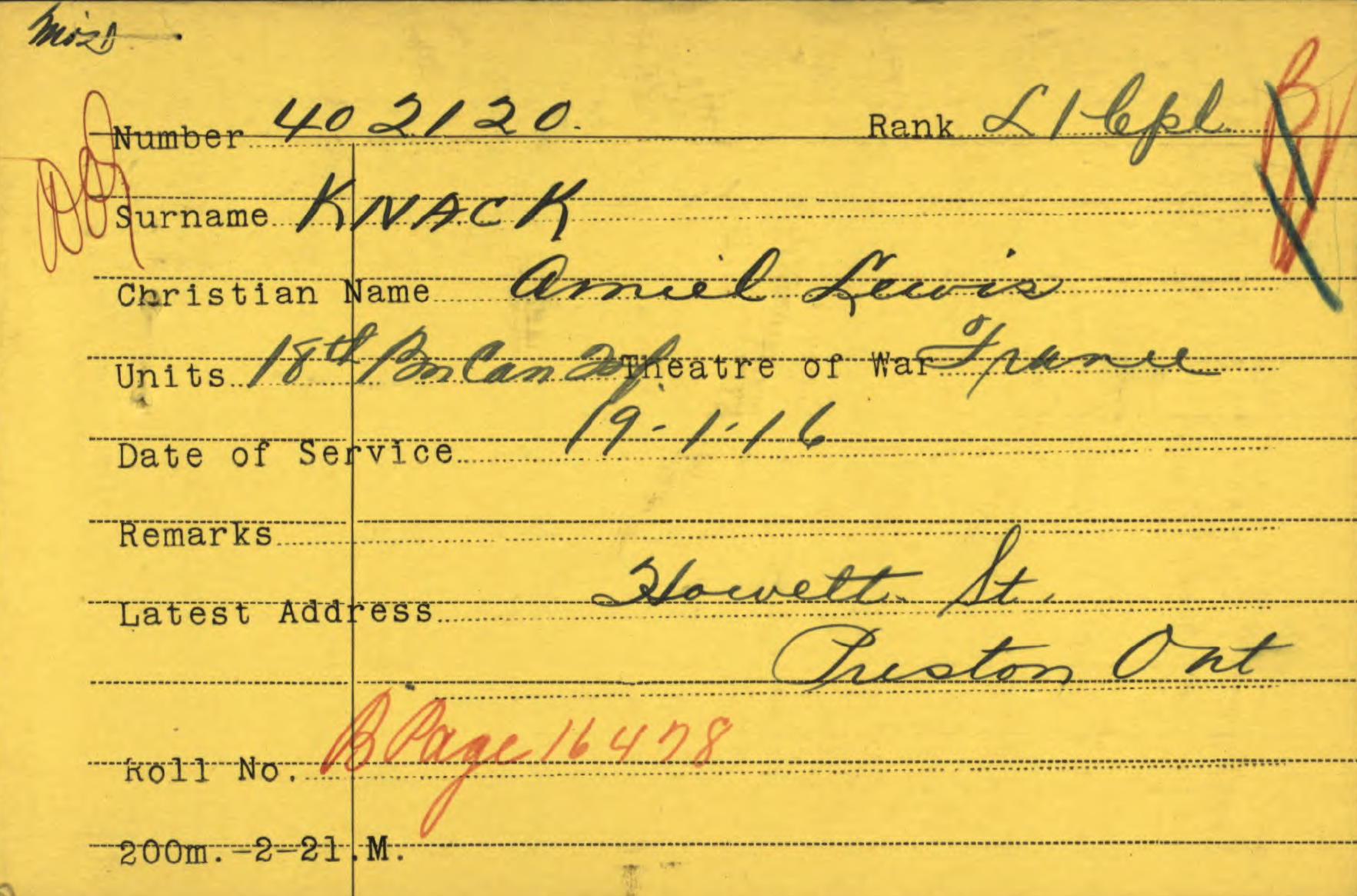Family Search: When Lance Corporal Amiel Louis Knack was born on 2 June 1893, in Preston, Waterloo, Ontario, Canada, his father, Heinrich Johann Christian Knack, was 37 and his mother, Maria Sophia Gillow, was 38. He had at least 1 son and 1 daughter with Mary Morrow. He lived in Wellington, Ontario, Canada in 1901 and Waterloo, Ontario, Canada in 1911. He registered for military service in 1914. In 1939, his occupation is listed as caretaker, Preston Post Office in Preston, Waterloo, Ontario, Canada. He died on 31 January 1985, in Cambridge, Waterloo, Ontario, Canada, at the age of 91, and was buried in Cambridge, Waterloo, Ontario, Canada.