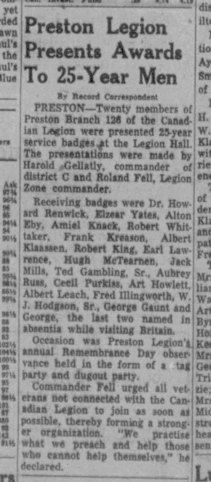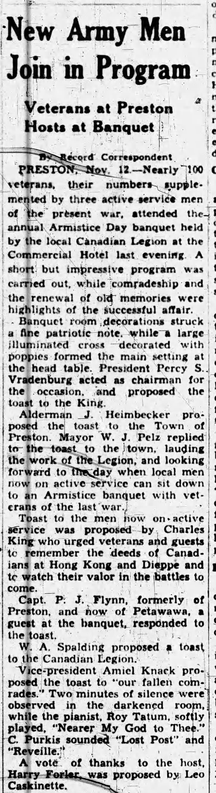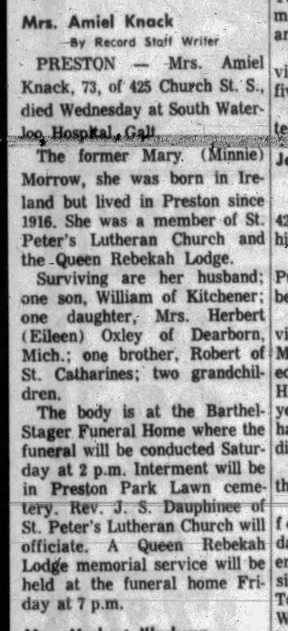 Family Search: When Lance Corporal Amiel Louis Knack was born on 2 June 1893, in Preston, Waterloo, Ontario, Canada, his father, Heinrich Johann Christian Knack, was 37 and his mother, Maria Sophia Gillow, was 38. He had at least 1 son and 1 daughter with Mary Morrow. He lived in Wellington, Ontario, Canada in 1901 and Waterloo, Ontario, Canada in 1911. He registered for military service in 1914. In 1939, his occupation is listed as caretaker, Preston Post Office in Preston, Waterloo, Ontario, Canada. He died on 31 January 1985, in Cambridge, Waterloo, Ontario, Canada, at the age of 91, and was buried in Cambridge, Waterloo, Ontario, Canada.
