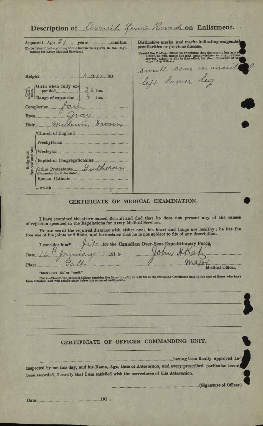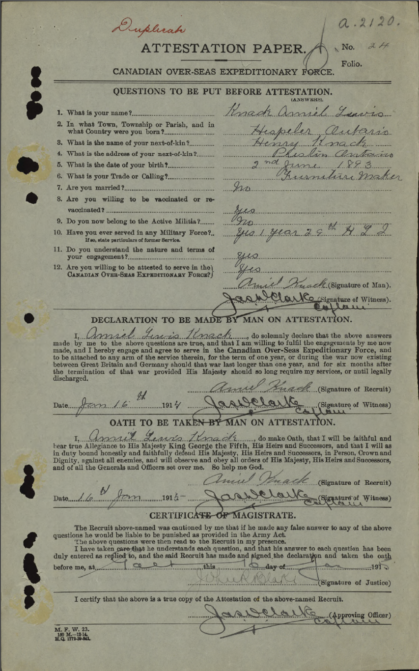 This man enlisted on 16 January 1915, along with his brother Charles Martin Knack, at Galt, Ontario.