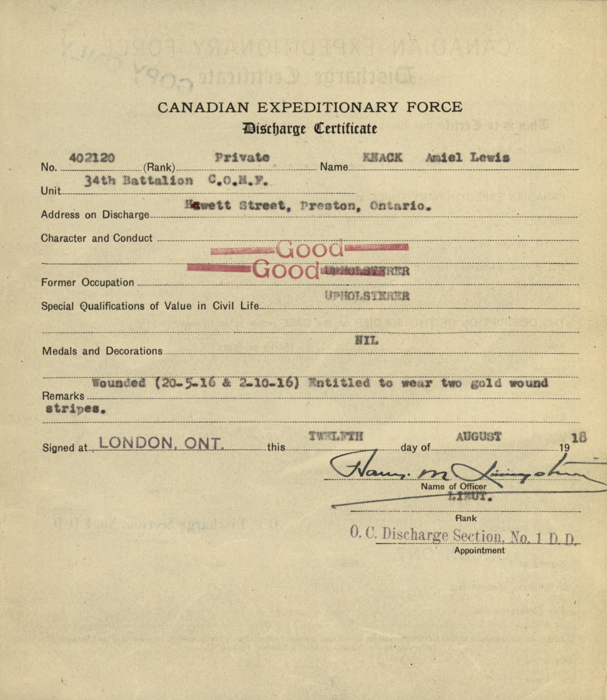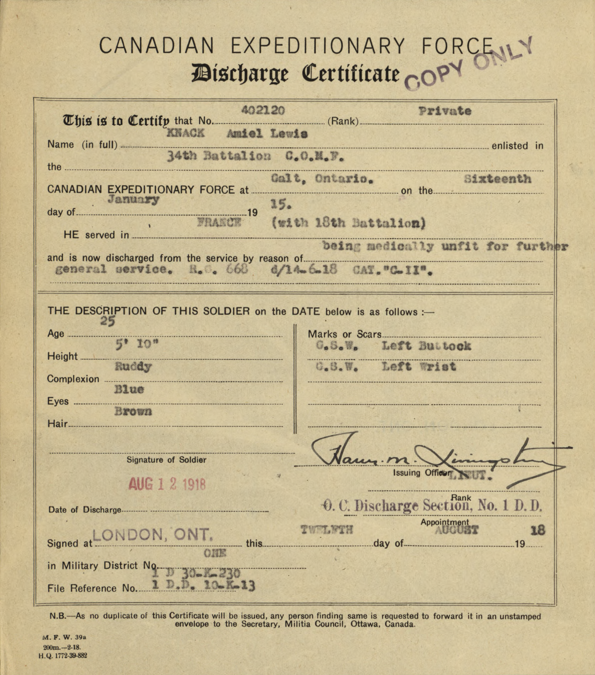 He was discharged as medically unfit for further general service on 12 August 1918, at London, Ontario.
