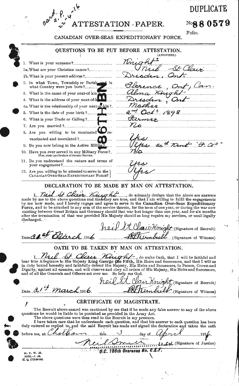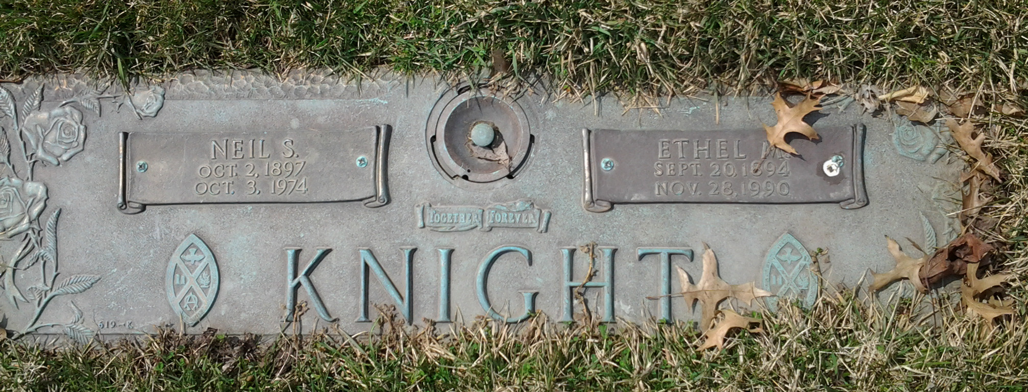 Family Search: When Private Neil St. Clair Knight was born on 2 October 1898, in Lambton, Ontario, Canada, his father, David Butler Knight, was 30 and his mother, Alma McKinley, was 26. He married Ethel Mary Hick on 18 March 1922, in Windsor, Essex, Ontario, Canada. They were the parents of at least 1 son and 2 daughters. He lived in Windsor, Sandwich, Essex, Ontario, Canada in 1922 and Maidstone Township, Essex, Ontario, Canada in 1931. In 1919, his occupation is listed as body builder in Windsor, Essex, Ontario, Canada. He died on 3 October 1974, in Windsor, Essex, Ontario, Canada, at the age of 76, and was buried in Victoria Memorial Gardens, Oldcastle, Essex, Ontario, Canada.