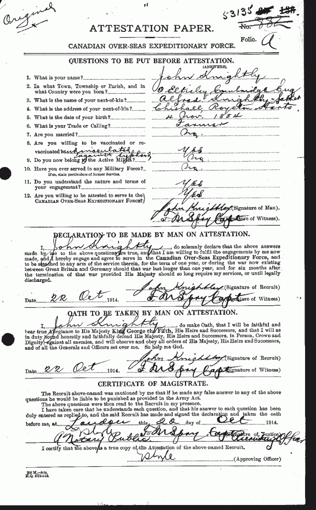 Note that the Nominal Roll (1915) spells this man’s name as “Knightley” and the LAC web site spells his name as “Knighty”.