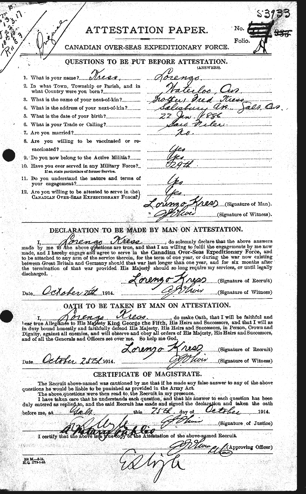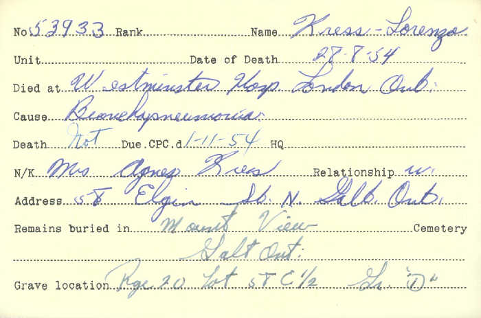 Family Search: When Private Lorenzo Marquis Kress was born on 22 January 1886, in Waterloo, Ontario, Canada, his father, August Alonzo Kress, was 34 and his mother, Elisabeth Thiel, was 23. He married Agnes Elizabeth Smith on 30 September 1919, in Galt, Waterloo, Ontario, Canada. They were the parents of at least 2 sons and 2 daughters. He lived in Waterloo North, Waterloo, Ontario, Canada in 1891. He registered for military service in 1914. In 1931, at the age of 45, his occupation is listed as treer. He died on 28 August 1954, in Galt, Waterloo, Ontario, Canada, at the age of 68, and was buried in Mount View Cemetery, Cambridge, Waterloo, Ontario, Canada.