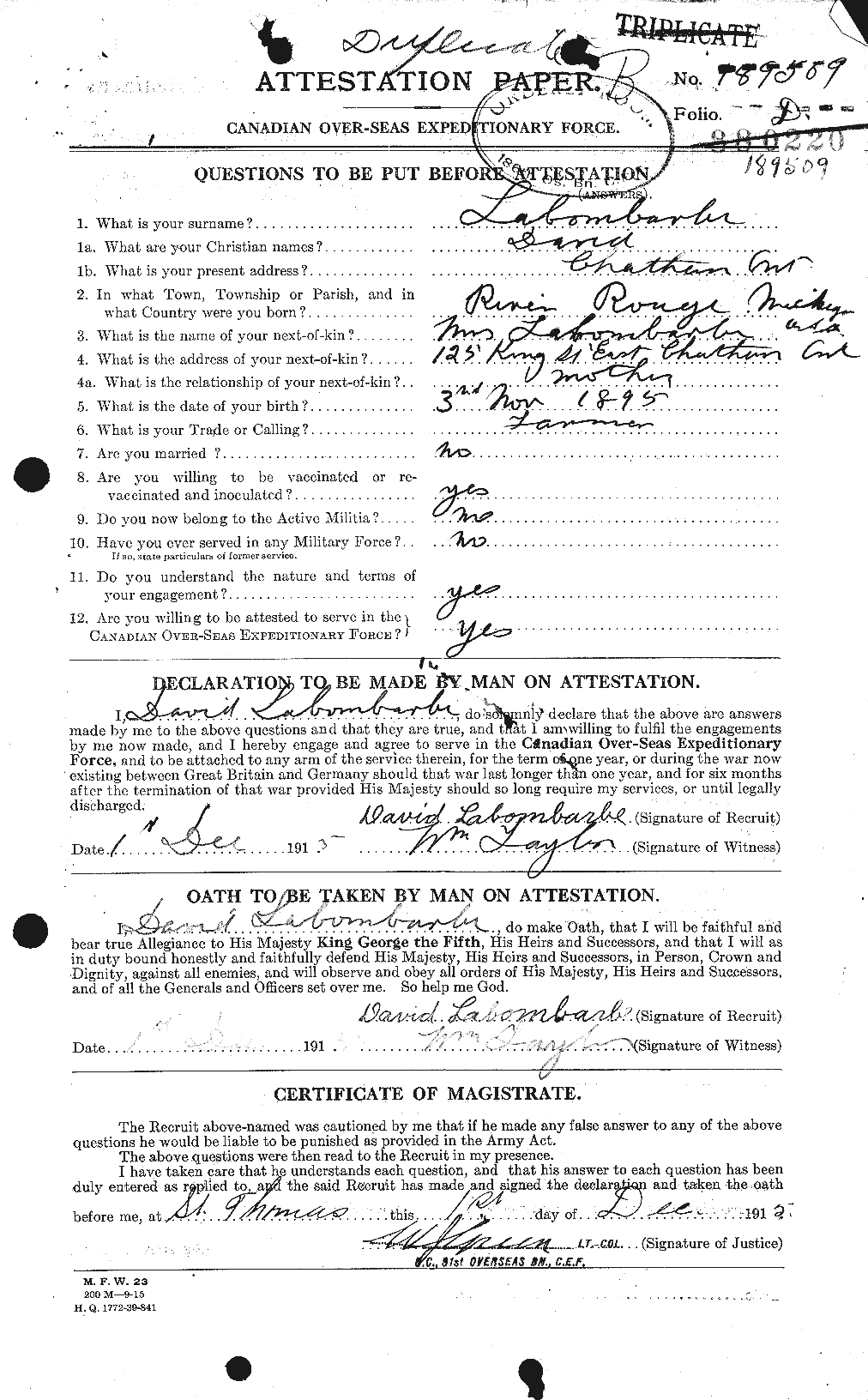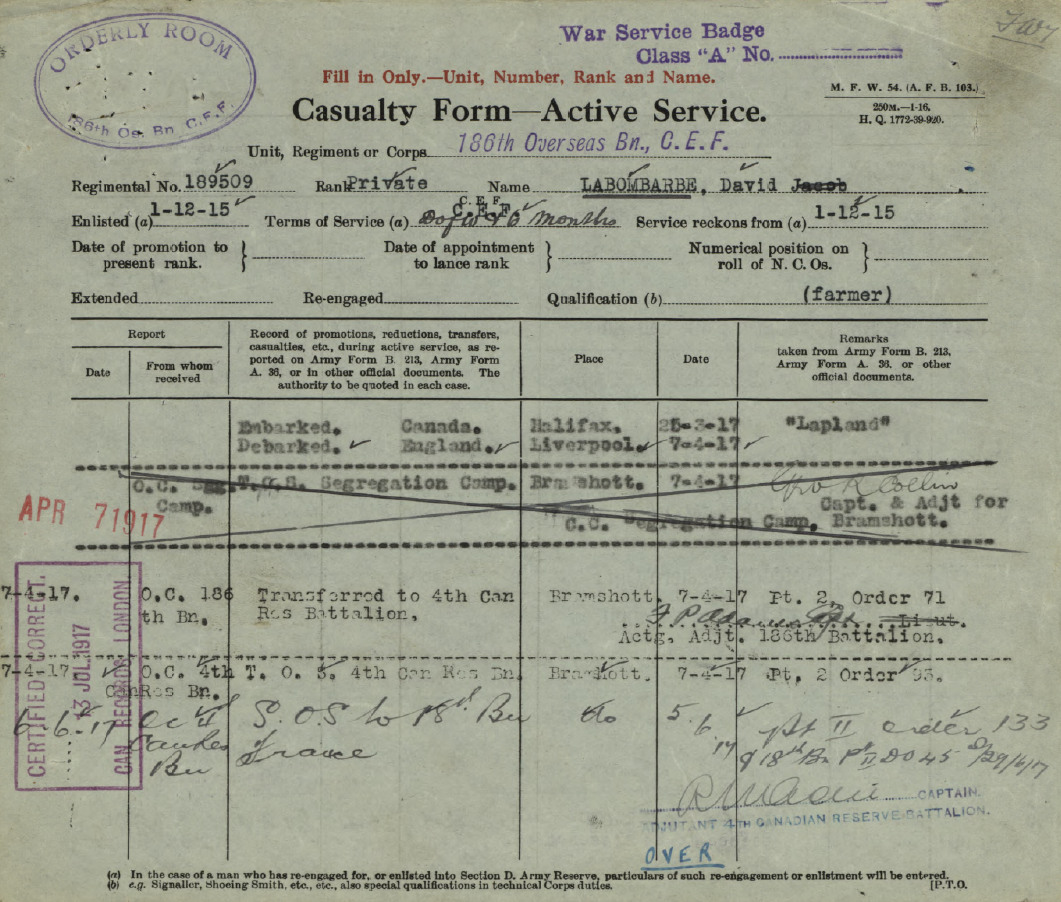 Labombarbe, David Jacob: Service no. 189509 Digitized Service Record Source: Gathering Our Heroes Find-A-Grave Wounded by shell bursting on road August 21, 1917. Labombarbe, David: Service no. 189509. Source: Gathering Our Heroes Share this: Click to email a link to a friend (Opens in new window) Email Click to share on Facebook (Opens in new window) Facebook Click to share on X (Opens in new window) X Click to share on Reddit (Opens in new window) Reddit Click to share on LinkedIn (Opens in new window) LinkedIn Click to print (Opens in new window) Print Click to share on Tumblr (Opens in new window) Tumblr Click to share on Pocket (Opens in new window) Pocket Click to share on Pinterest (Opens in new window) Pinterest Click to share on Telegram (Opens in new window) Telegram Click to share on WhatsApp (Opens in new window) WhatsApp Like Loading...