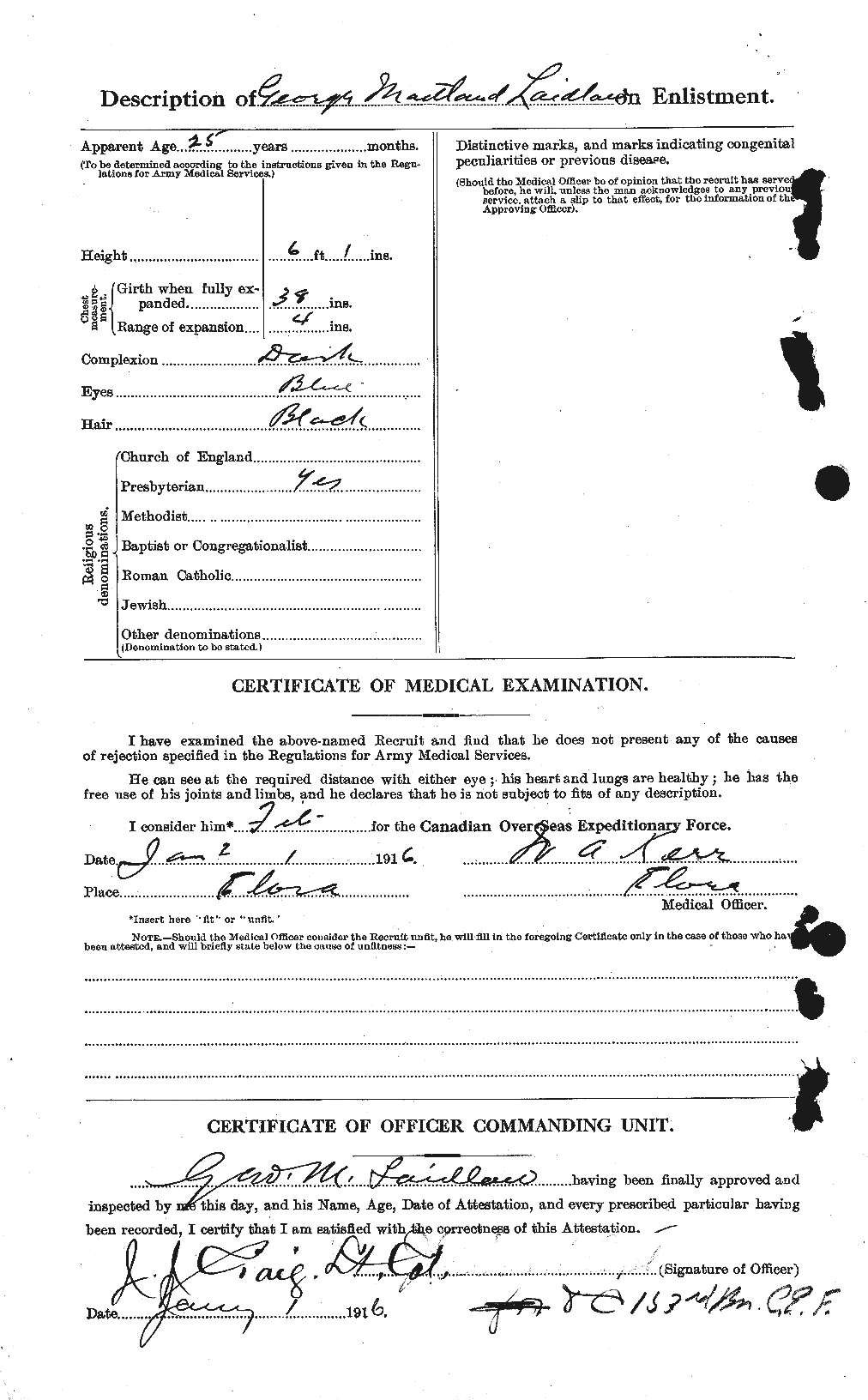 Trade listed as u/k. DOB 8-1-89, born Canada. 6 foot 1 inch. Blue eyes, black hair. Presbyterian. NOK John Laidlaw, father. Annie Laidlaw, mother. Enlisted Elora 1-1-16 (age 25 years). On 153rd Battalion Nominal Roll 5-2-16, no transfers noted. On 153rd Nominal Rolls as published Guelph Mercury 10-6-16 and 1-12-16. Embarked with 153rd Halifax N.S. SS Olympic 29-4-17. Arrived Liverpool 7-5-16. Assigned 25th Reserve for Training and Administration. Taken on Strength 18th Battalion 14-12-17. Returned to Canada aboard SS Caronia 22-5-19, Halifax, N. Demobilized London 24-4-19. Ontario Marriage Registry (012331) married 24-12-27 to Elizabeth Kerr at Ingersol.