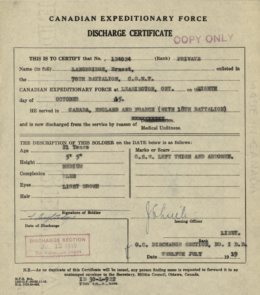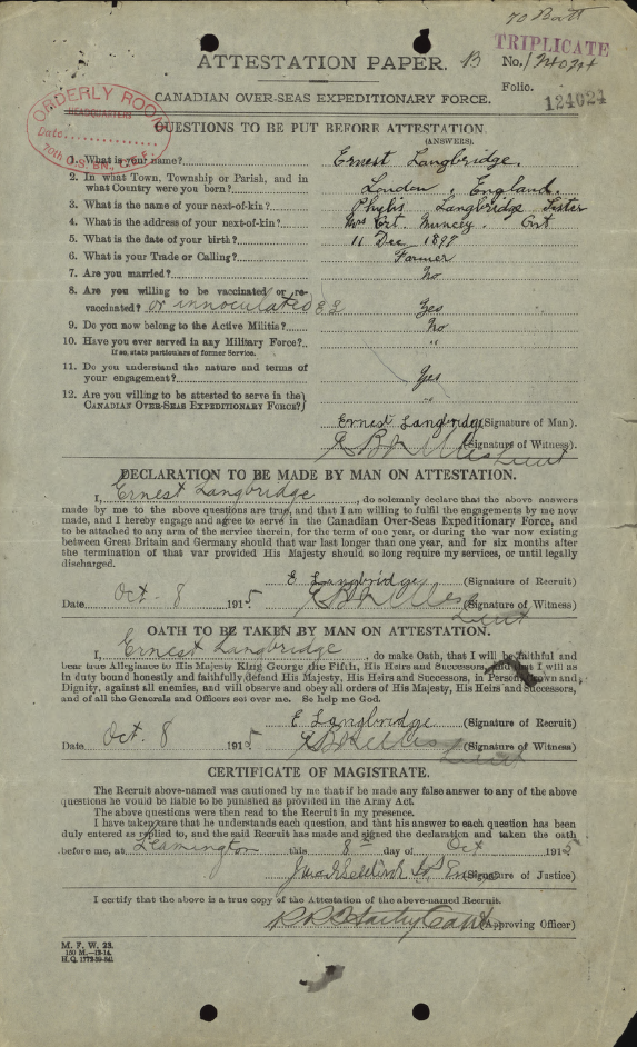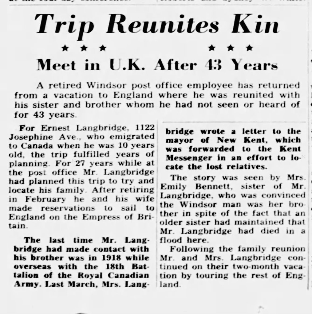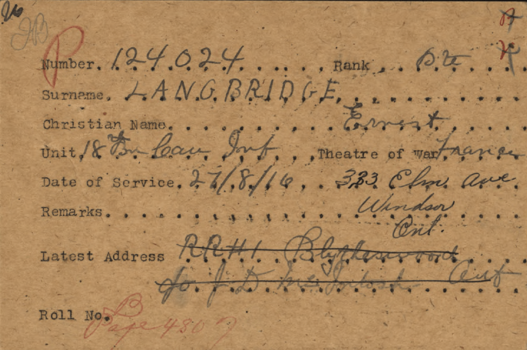 Family Search: When Private Ernest Frank Langbridge was born on 11 December 1898, in Wandsworth, London, England, United Kingdom, his father, Harry M Langridge, was 31 and his mother, Mary Ellen Bailey, was 37. He married Angela Pearl Rozelle on 30 August 1919, in London, Ontario, Canada. They were the parents of at least 1 daughter. He immigrated to Saint John, St. John, New Brunswick, Canada in 1912 and lived in Bournemouth, Hampshire, England, United Kingdom in 1911 and Windsor, Sandwich, Essex, Ontario, Canada in 1920. He registered for military service in 191. In 1936, his occupation is listed as postal clerk in Windsor, Essex, Ontario, Canada. He died on 17 December 1972, in Windsor, Essex, Ontario, Canada, at the age of 74, and was buried in Oldcastle, Essex, Ontario, Canada.