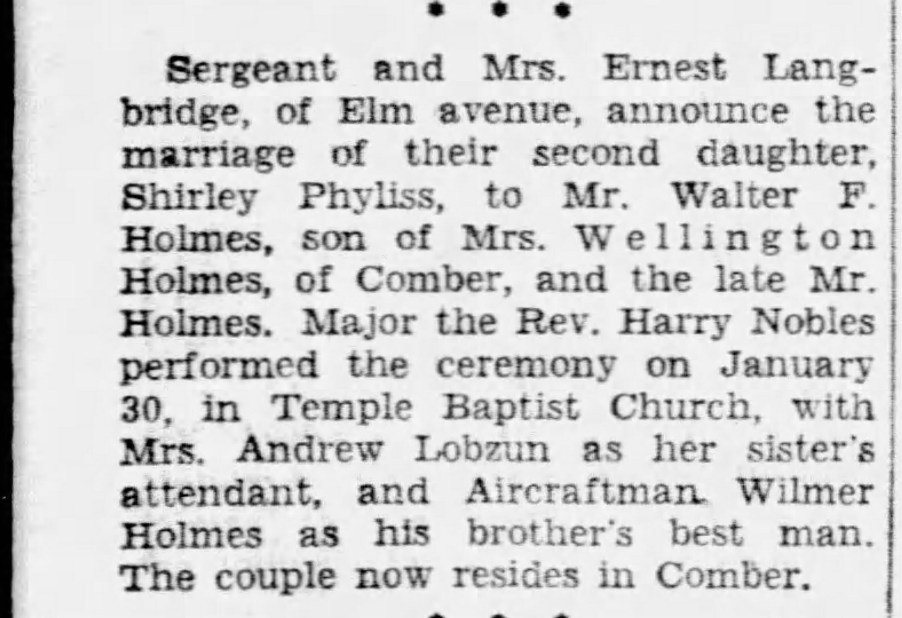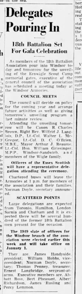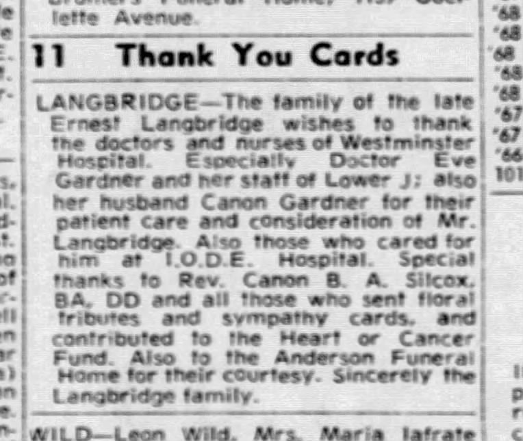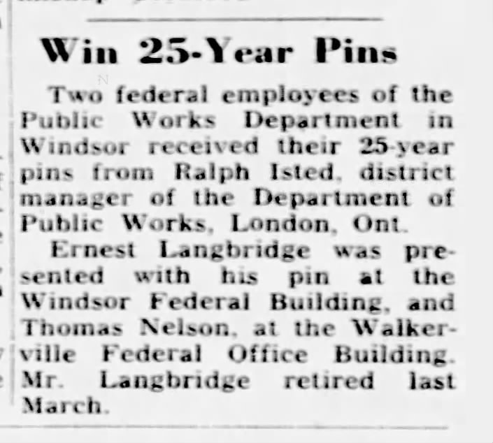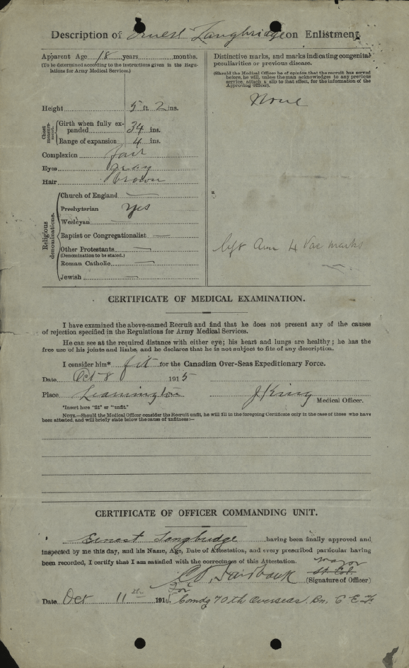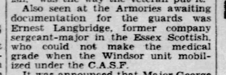 Family Search: When Private Ernest Frank Langbridge was born on 11 December 1898, in Wandsworth, London, England, United Kingdom, his father, Harry M Langridge, was 31 and his mother, Mary Ellen Bailey, was 37. He married Angela Pearl Rozelle on 30 August 1919, in London, Ontario, Canada. They were the parents of at least 1 daughter. He immigrated to Saint John, St. John, New Brunswick, Canada in 1912 and lived in Bournemouth, Hampshire, England, United Kingdom in 1911 and Windsor, Sandwich, Essex, Ontario, Canada in 1920. He registered for military service in 191. In 1936, his occupation is listed as postal clerk in Windsor, Essex, Ontario, Canada. He died on 17 December 1972, in Windsor, Essex, Ontario, Canada, at the age of 74, and was buried in Oldcastle, Essex, Ontario, Canada.