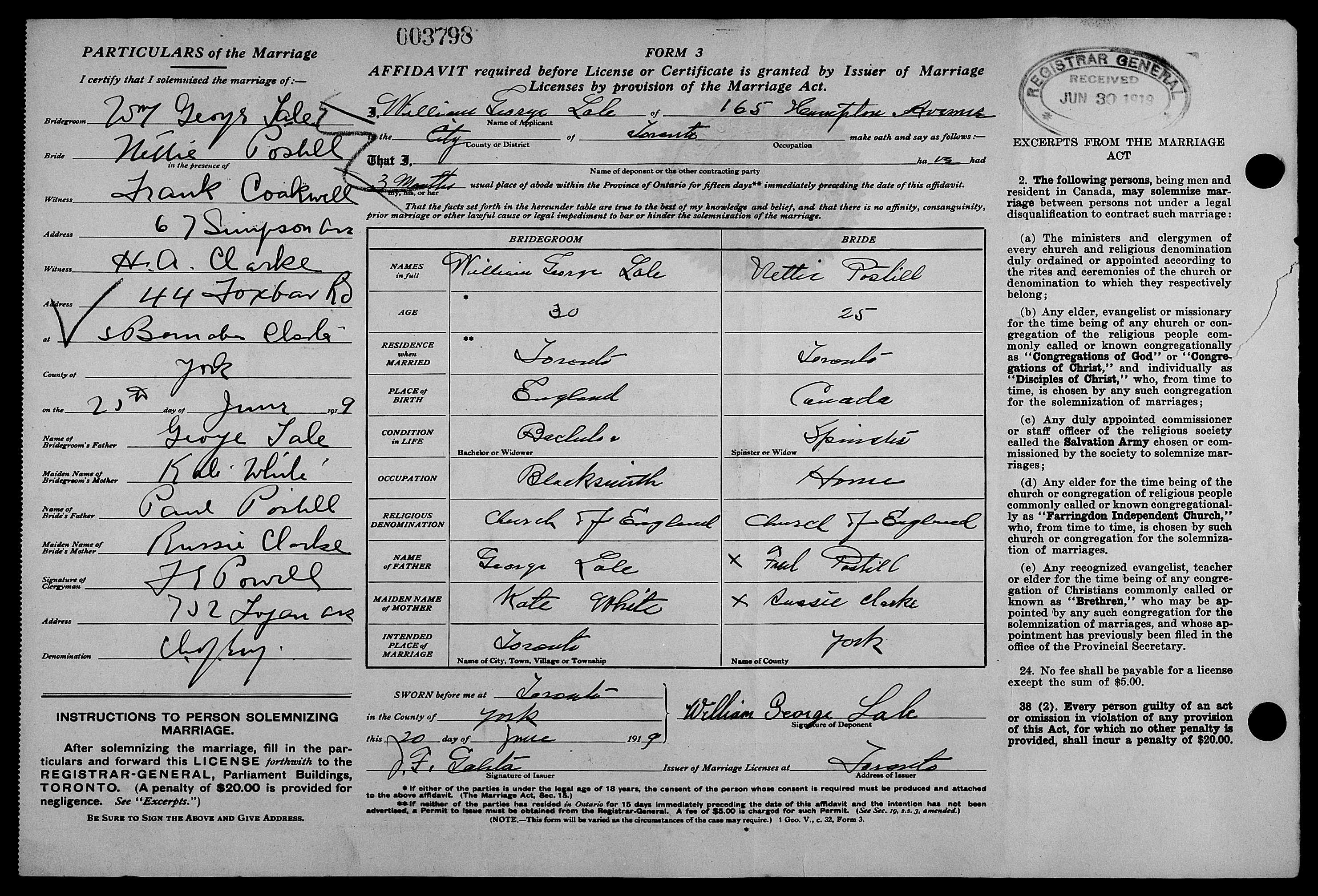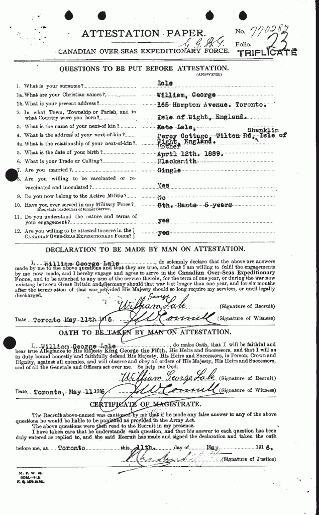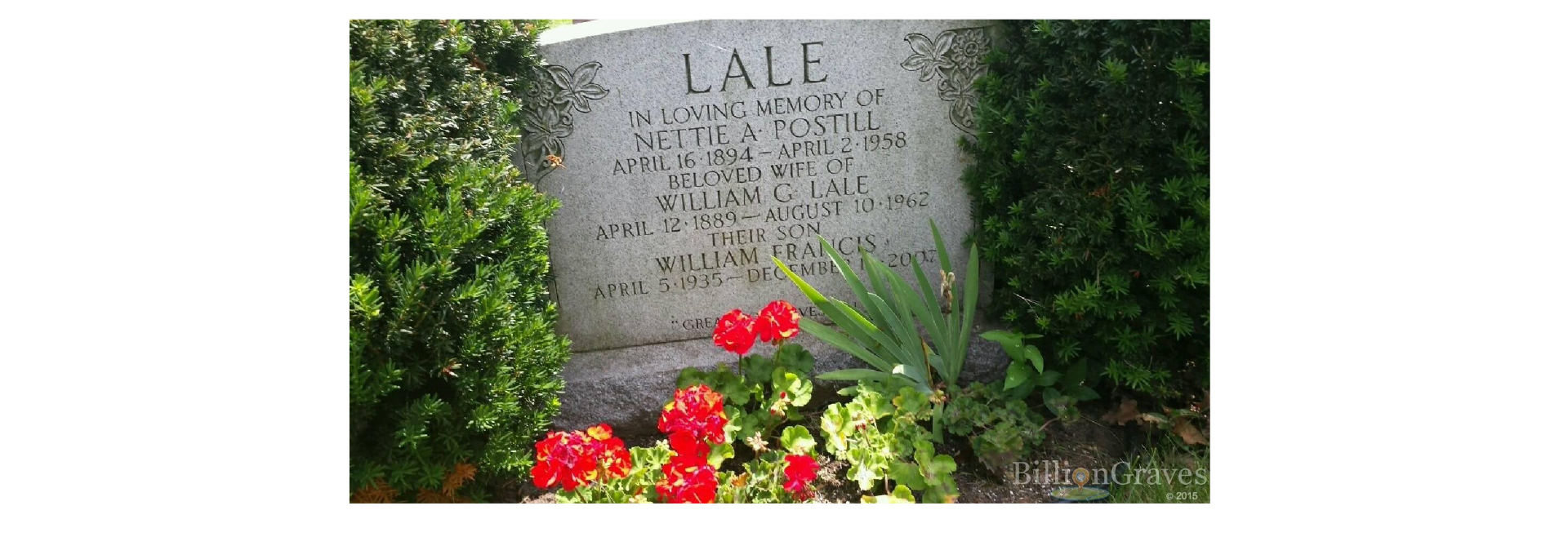 Family Search: When Private William George Lale was born on 12 April 1889, in Isle of Wight, Hampshire, England, United Kingdom, his father, George Lale, was 24 and his mother, Kate Lale, was 23. He married Nettie Amelia Postill on 25 June 1919, in York Township, Toronto, Ontario, Canada. They were the parents of at least 1 son and 1 daughter. He lived in Sandown, Hampshire, England, United Kingdom for about 10 years and Scarborough, Toronto, Ontario, Canada in 1931. He died on 10 April 1962, in Scarborough, York, Ontario, Canada, at the age of 72, and was buried in Pine Hills Cemetery, Scarborough, Toronto, Ontario, Canada.