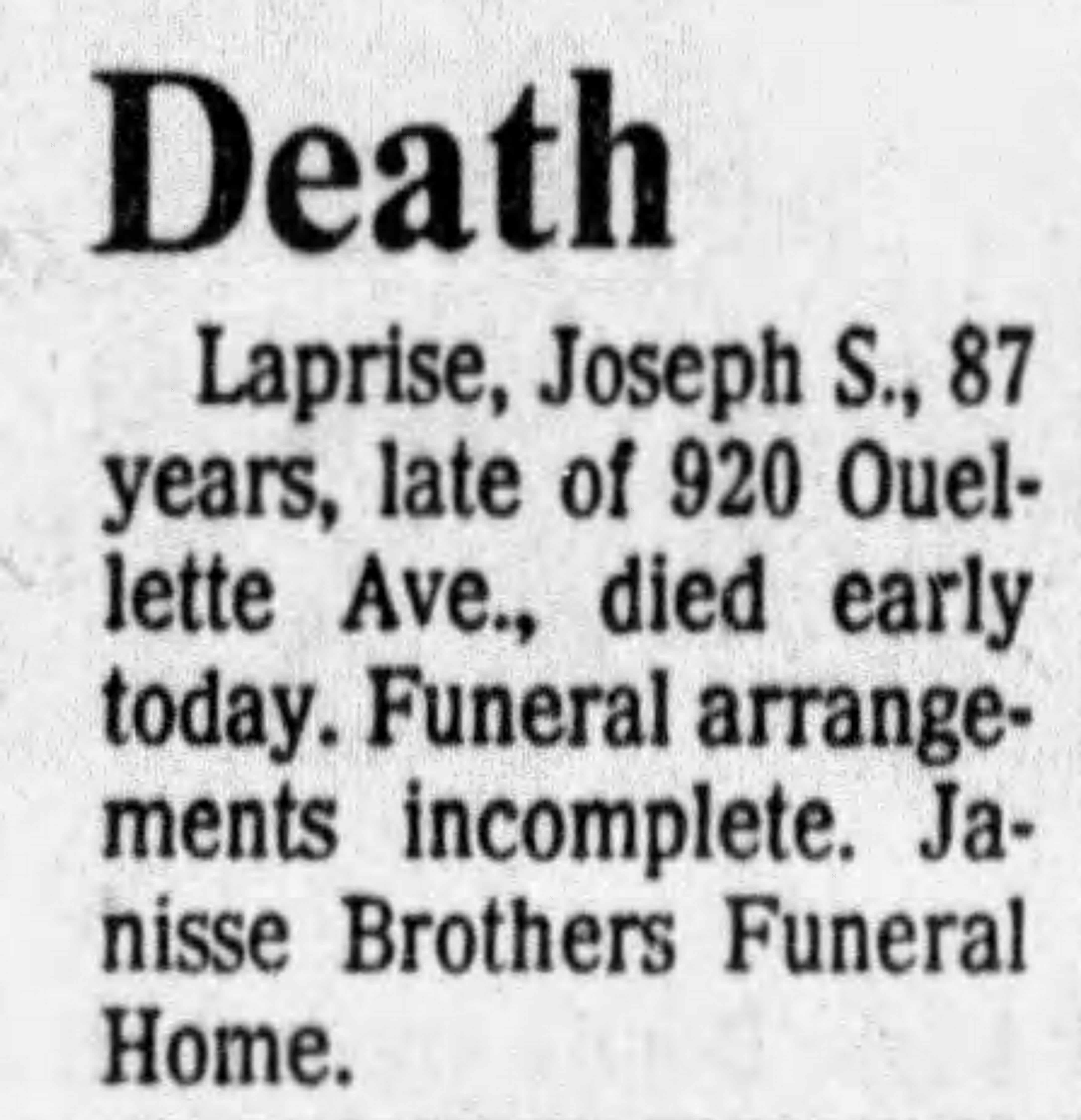 Family Search: When Private Solomon Joseph Laprise was born on 11 September 1897, in Pain Court, Kent, Ontario, Canada, his father, Joseph Laprise, was 31 and his mother, Helene Roy, was 24. He married Mabel Margaret Ellen Mchugh on 22 February 1922, in Essex, Ontario, Canada. They were the parents of at least 1 son and 2 daughters. He immigrated to Niagara Falls, Niagara, New York, United States in 1943 and lived in Chatham, Kent, Ontario, Canada in 1916 and Windsor, Sandwich Township, Essex, Ontario, Canada in 1922. He registered for military service in 1916. In 1916, at the age of 19, his occupation is listed as bookkeeper in Chatham, Kent, Ontario, Canada. He died on 10 August 1985, in Windsor, Essex, Ontario, Canada, at the age of 87, and was buried in Windsor, Essex, Ontario, Canada.