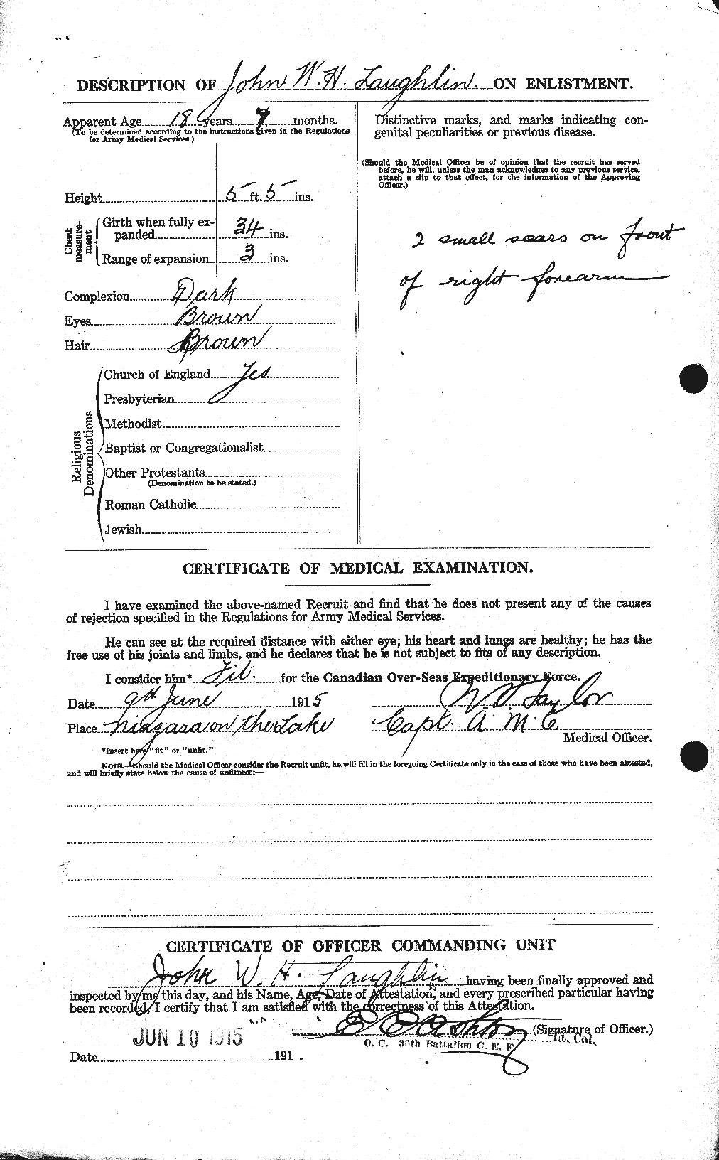| June 10, 1915 | Enlisted | Enlisted with the 36th Battalion at Niagara Camp, Niagara-on-the-Lake, He was a farmer standing 5’5” tall with a dark complexion, brown eyes, and brown hair. He had a small scar on inside of right knee. He is 140 lbs. He is 18-years and 7-months old. He had no prior military experience. His next-kin- is listed a George Laughlin and is later changed to S.G. Wolfe, care of Mr. William Hunter, Purpleville, Ontario. |