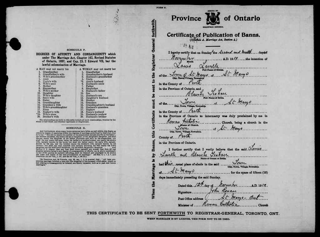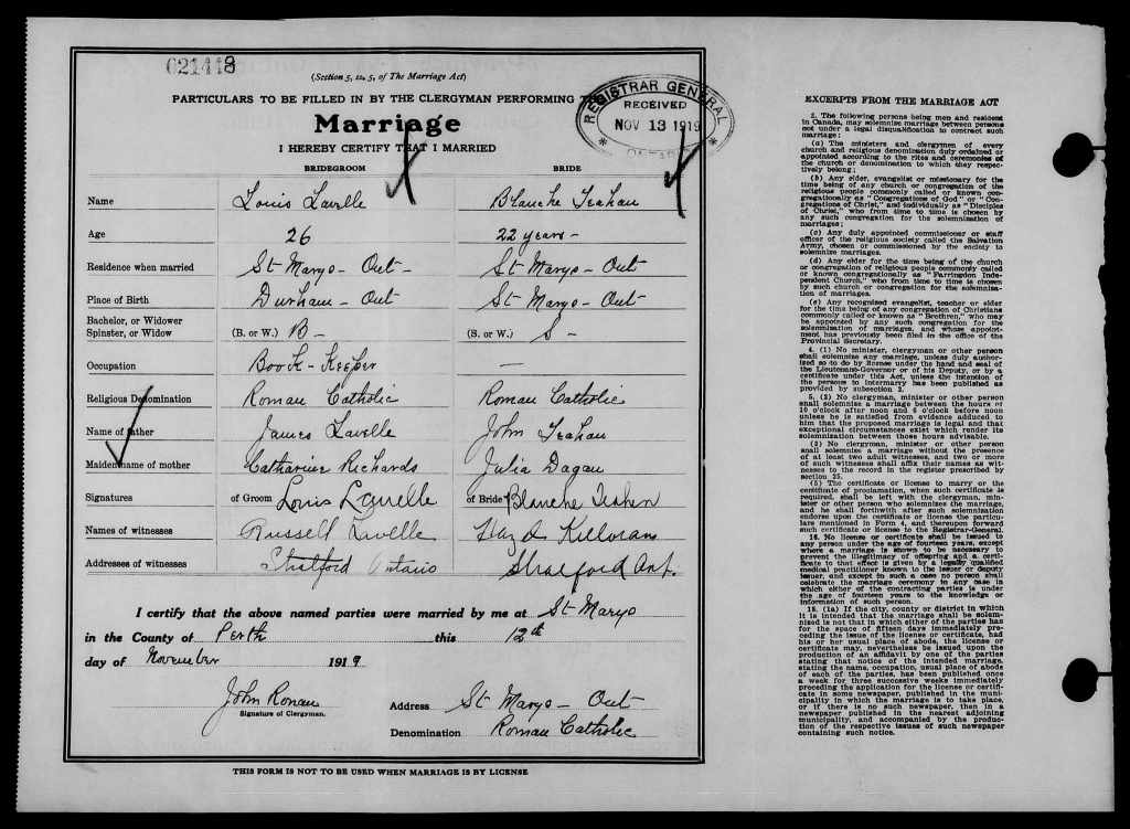 Lewis Edward Lavelle was born on Decembet [December] 1, 1892 in Durham, Ontario. He signed his Particulars of a Recruit Drafted Under Military Act, 1917 Paper on October 4, 1917 at No. 1 Military District Depot in London, Ontario, naming his father, James Lavelle of Stratford, Ontario as his next-of-kin, stating that he had no previous military service, that he was single and that his trade was that of Bookkeeper and Stenographer. Lavelle embarked Canada on April 16, 1918, arriving in England on the 28th. Upon arrival, he was transferred to the 4th Canadian Reserve Battalion at Witley. After five months of training and orientation, he was struck off strength to the 18th Infantry Battalion on September 4, 1918, arriving at the Canadian Corps Reinforcement Camp on the 9th. Two days later, he was transferred to the 3rd Infantry Battalion on the 11th, taken on strength in the field at Etaples, France on the 12th. Lavelle served six months in the French theatre and upon the ceasing of hostilities, he proceeded to England on March 22, 1919. He was struck off strength to Canada at Bramshott on April 14th, proceeeding to Canada on the 15th aboard the S.S. Olympic on the 16th. Lavelle was discharged upon demobilization at No. 2 District Depot in Toronto, Ontario on April 24, 1919, with his proposed residence stated as Stratford.