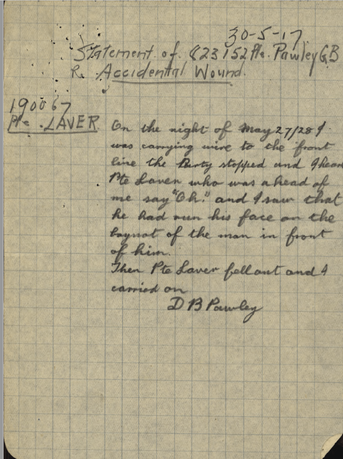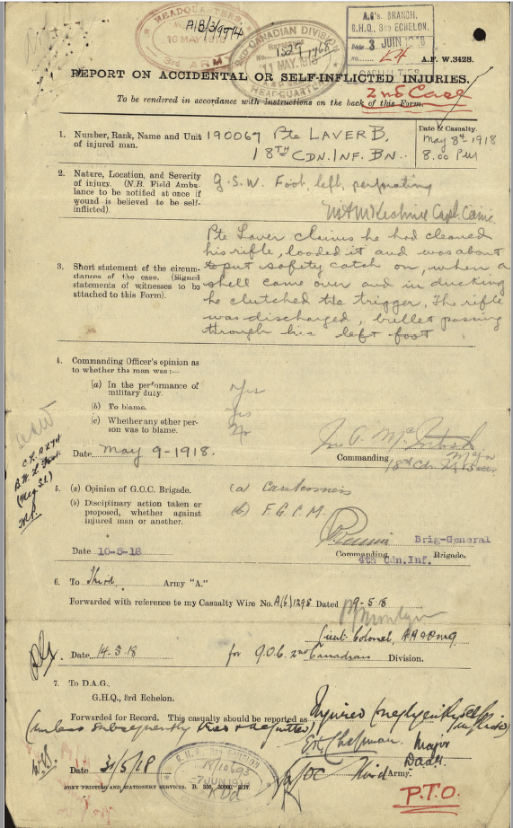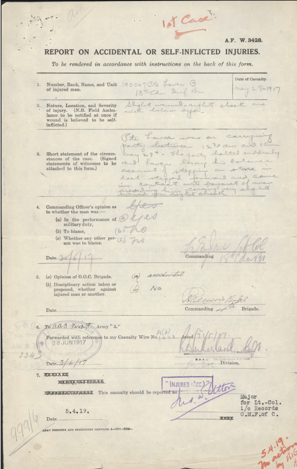 He arrived in England on November 11, 1916, and was attached to the 18th Battalion on April 13, 1917, after service at Dibgate, West Sandling, and Bramshott. He arrived for active service on May 2, 1917, and served with the Battalion until accidentally wounded on the 28th by a bayonet. This wounding was deemed accidental.