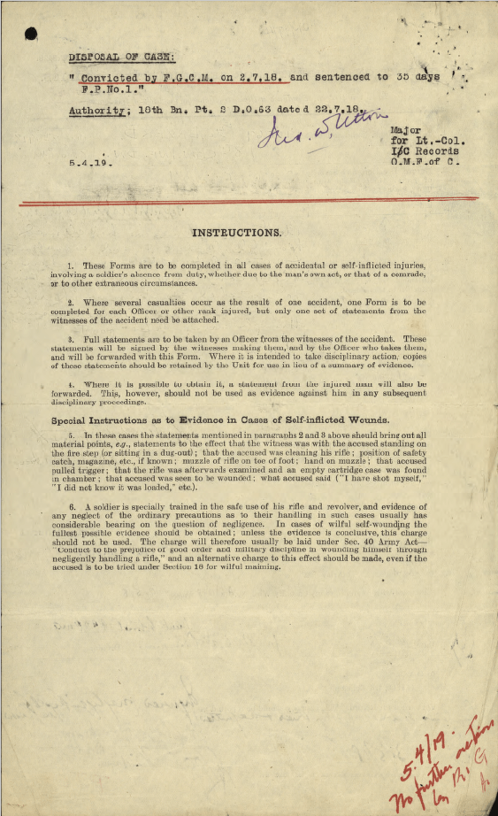 He was granted 14-day’s leave to England on December 24, 1917, and was arrested in England on February 2, 1918, for being absent without leave. He was convicted of this offence and was given the loss of 39-day’s pay.