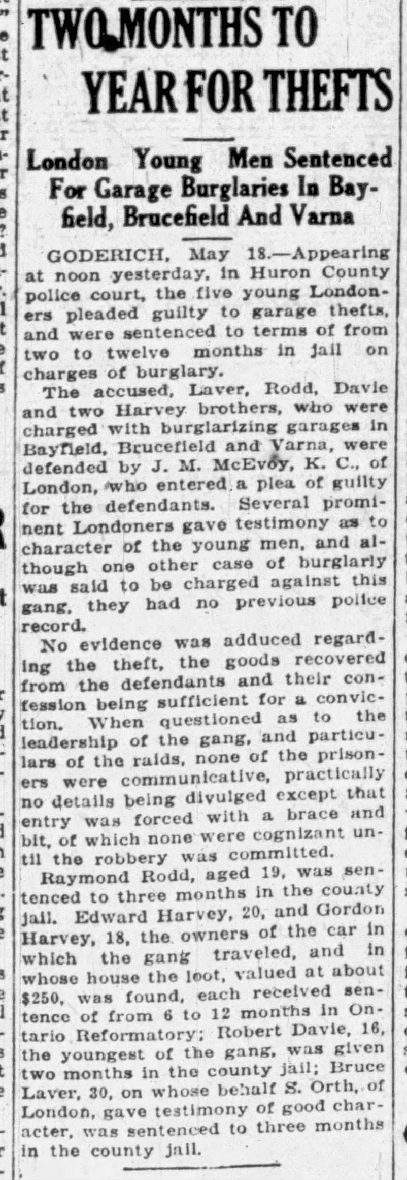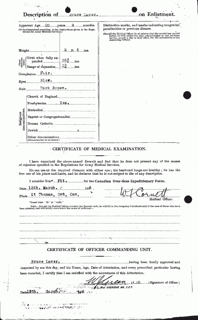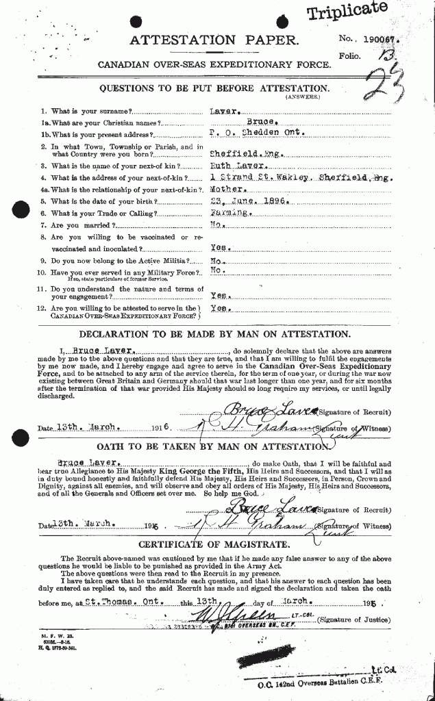 Family Search: When Private Bruce Laver was born on 23 June 1896, in Sheffield, South Yorkshire, England, United Kingdom, his father, George Laver, was 24 and his mother, Ruth McBride, was 22. He married Ivy Ada Carter on 14 July 1922, in London, Ontario, Canada. He immigrated to Canada in 1909 and lived in Sheffield, Yorkshire, England, United Kingdom in 1901 and Norfolk, Ontario, Canada in 1911. He registered for military service in 1915. In 1915, at the age of 19, his occupation is listed as farming. He died on 24 March 1980, in London, Canada West, British North America, at the age of 83, and was buried in Mount Pleasant Cemetery, West McGillivray, Middlesex, Ontario, Canada.