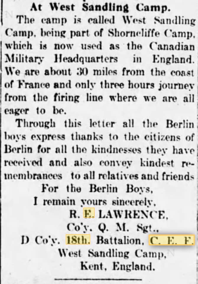 Later a lieutenant. Wounded August 28th, 1918. War Diary often spells his surname “Lawrence”.
