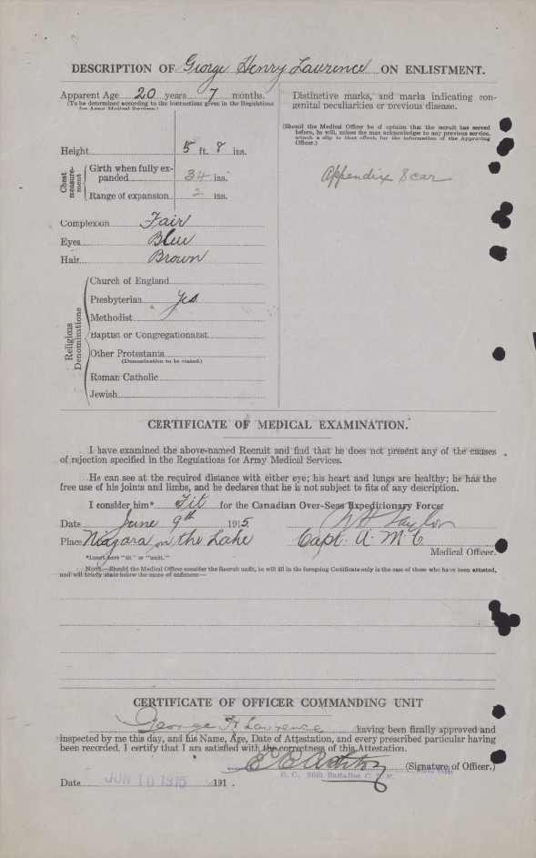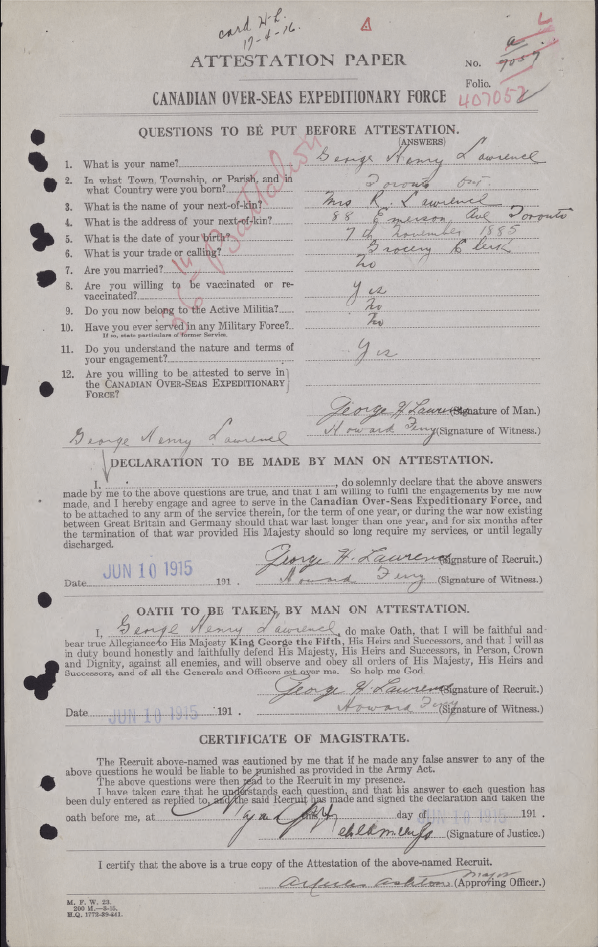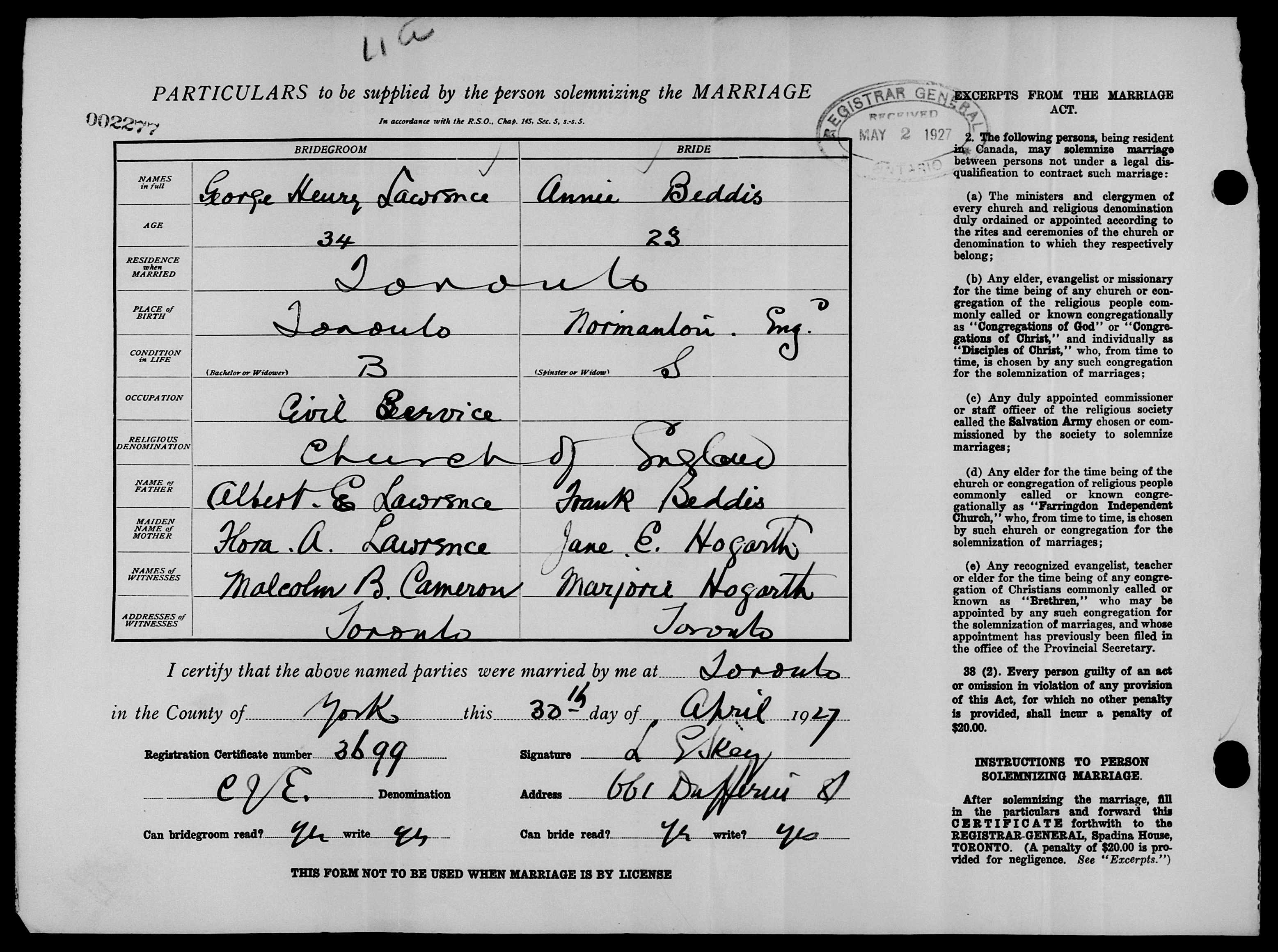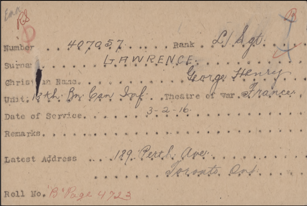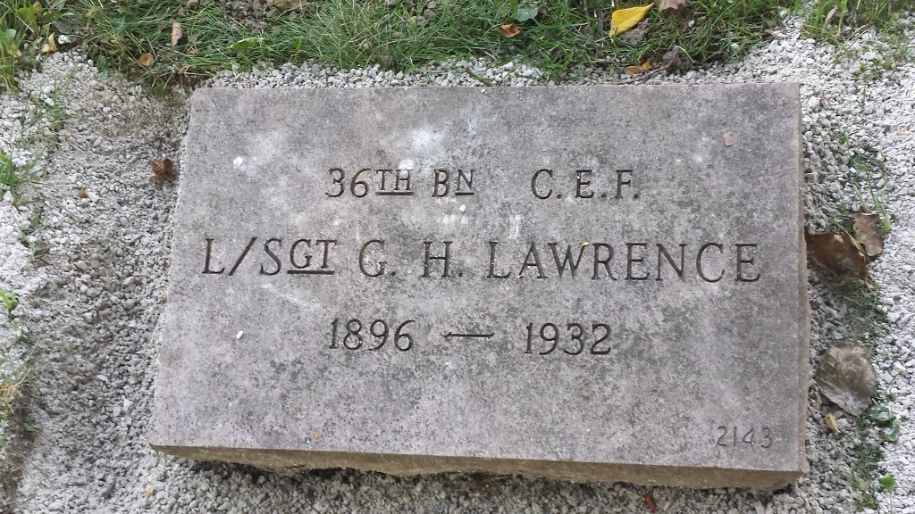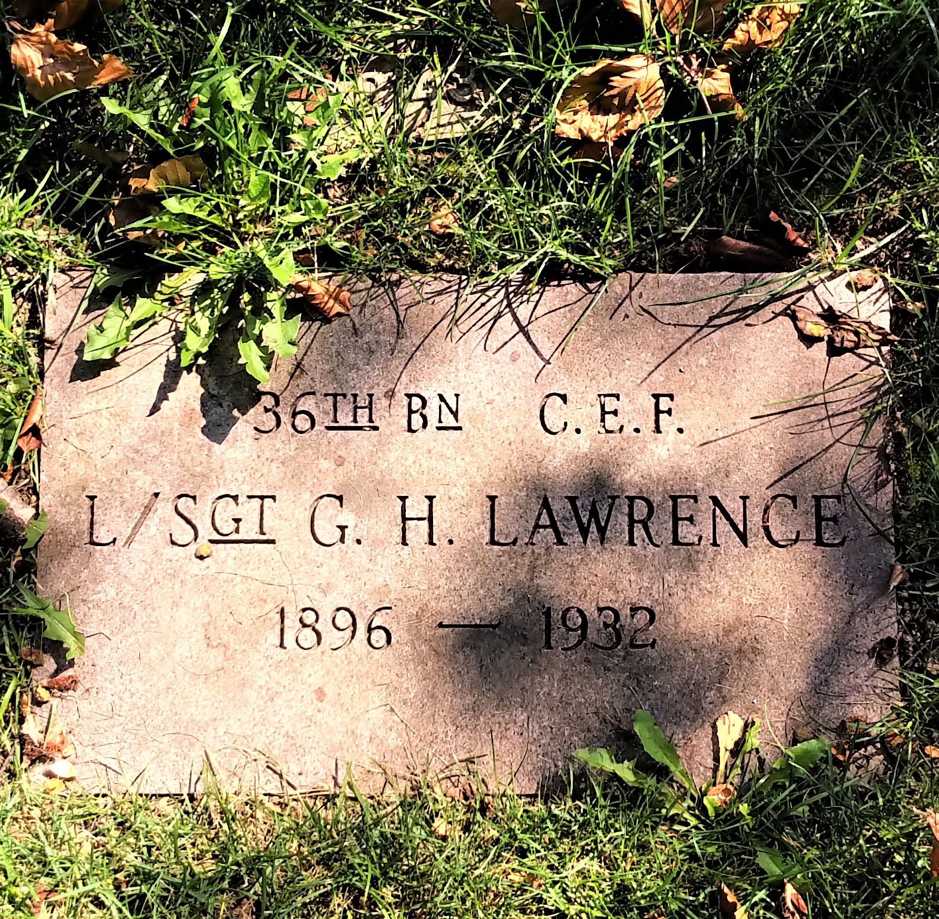 Family Search: When Lance-Sergeant George Henry Lawrence was born on 27 November 1892, in Toronto, Ontario, Canada, his father, Albert Edward Lawrence, was 34 and his mother, Flora Ann Maud Lawrence, was 24. He married Annie Beddis on 10 April 1927, in Toronto, York, Ontario, Canada. He lived in Ontario, Canada in 1892 and Toronto, York, Ontario, Canada in 1911. He registered for military service in 1915. In 1915, at the age of 23, his occupation is listed as grocery clerk. He died on 30 August 1932, in Brampton, Peel, Ontario, Canada, at the age of 39, and was buried in Prospect Cemetery, Toronto, Ontario, Canada.