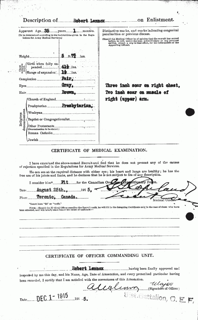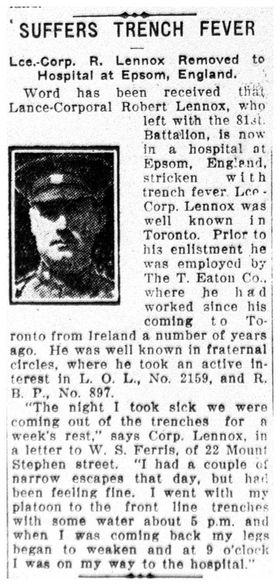 Lennox, Robert: Service no. 157621 Digitized Service Record Source: Per news clipping post by David Archer at 18th Battalion Facebook Page (not group). Find-A-Grave Lennox, Robert: Service no. 157621. Source: Toronto Telegram. 1916. Via David Archer. Share this: Click to email a link to a friend (Opens in new window) Email Click to share on Facebook (Opens in new window) Facebook Click to share on X (Opens in new window) X Click to share on Reddit (Opens in new window) Reddit Click to share on LinkedIn (Opens in new window) LinkedIn Click to print (Opens in new window) Print Click to share on Tumblr (Opens in new window) Tumblr Click to share on Pocket (Opens in new window) Pocket Click to share on Pinterest (Opens in new window) Pinterest Click to share on Telegram (Opens in new window) Telegram Click to share on WhatsApp (Opens in new window) WhatsApp Like Loading...
