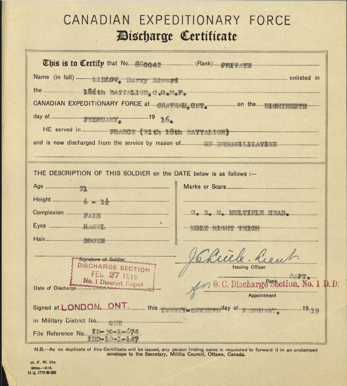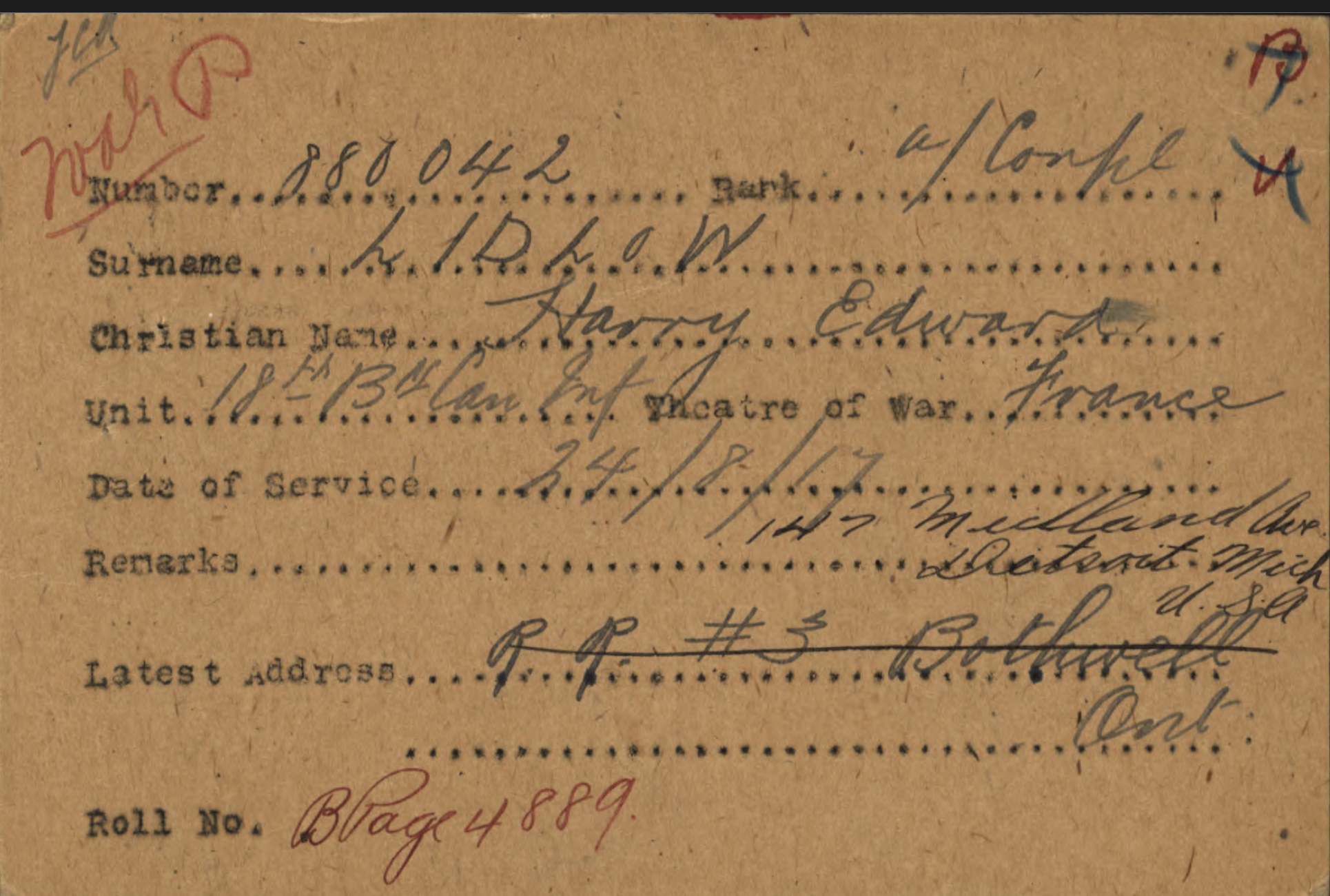 Family Search: When Private Harry Edward Lidlow was born on 18 July 1897, in Sevenoaks, Kent, England, United Kingdom, his father, Stephen Lidlow, was 47 and his mother, Mary Maria Masters, was 35. He married Louise E Guyes on 2 June 1925, in Highland Park, Wayne, Michigan, United States. They were the parents of at least 2 sons and 1 daughter. He immigrated to Detroit, Wayne, Michigan, United States in 1919 and lived in Detroit, Wayne, Michigan, United States in 1921 and Aldborough Township, Elgin, Ontario, Canada in 1931. He registered for military service in 1916. In 1931, at the age of 34, his occupation is listed as farmer in Aldborough Township, Elgin, Ontario, Canada. He died on 14 October 1983, in Windsor, Essex, Ontario, Canada, at the age of 86, and was buried in Heavenly Rest Catholic Cemetery, Windsor, Essex, Ontario, Canada.