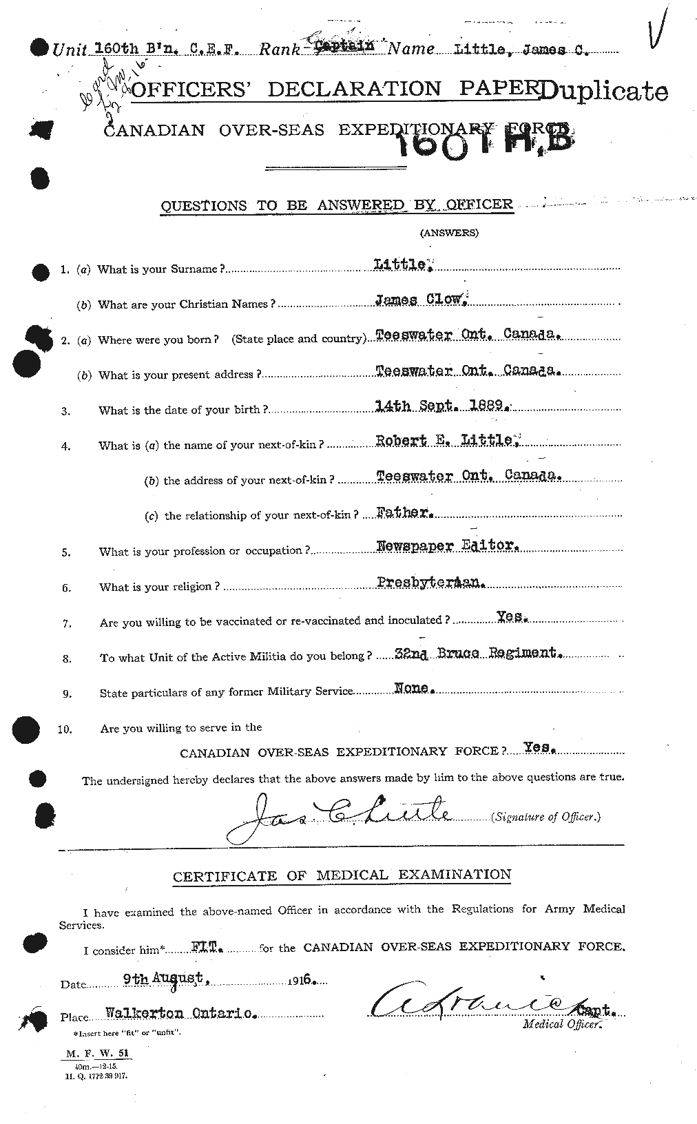 Extracts from a letter written by Capt. J.C. Little to his wife dated August 30, 1918 and printed in the ‘Teeswater News’ on October 10, 1918 .