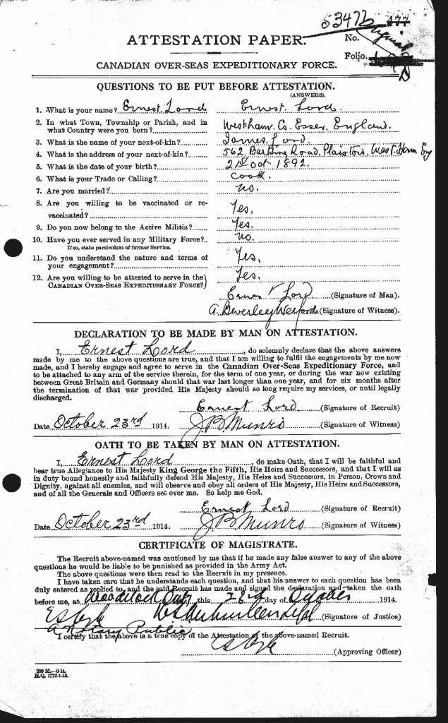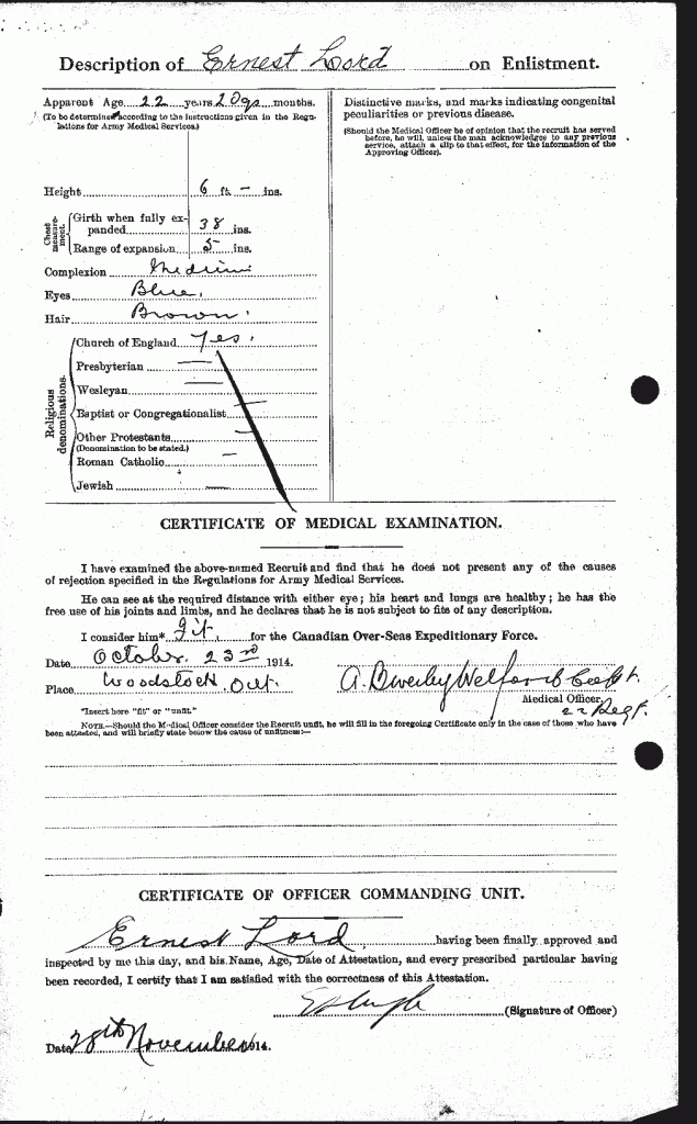 Lord, Ernest: Service no. 53477 Digitized Service Record Source: 18th Battalion Nominal Roll, April 1915. Find-A-Grave Family Search Share this: Click to email a link to a friend (Opens in new window) Email Click to share on Facebook (Opens in new window) Facebook Click to share on X (Opens in new window) X Click to share on Reddit (Opens in new window) Reddit Click to share on LinkedIn (Opens in new window) LinkedIn Click to print (Opens in new window) Print Click to share on Tumblr (Opens in new window) Tumblr Click to share on Pocket (Opens in new window) Pocket Click to share on Pinterest (Opens in new window) Pinterest Click to share on Telegram (Opens in new window) Telegram Click to share on WhatsApp (Opens in new window) WhatsApp Like Loading...