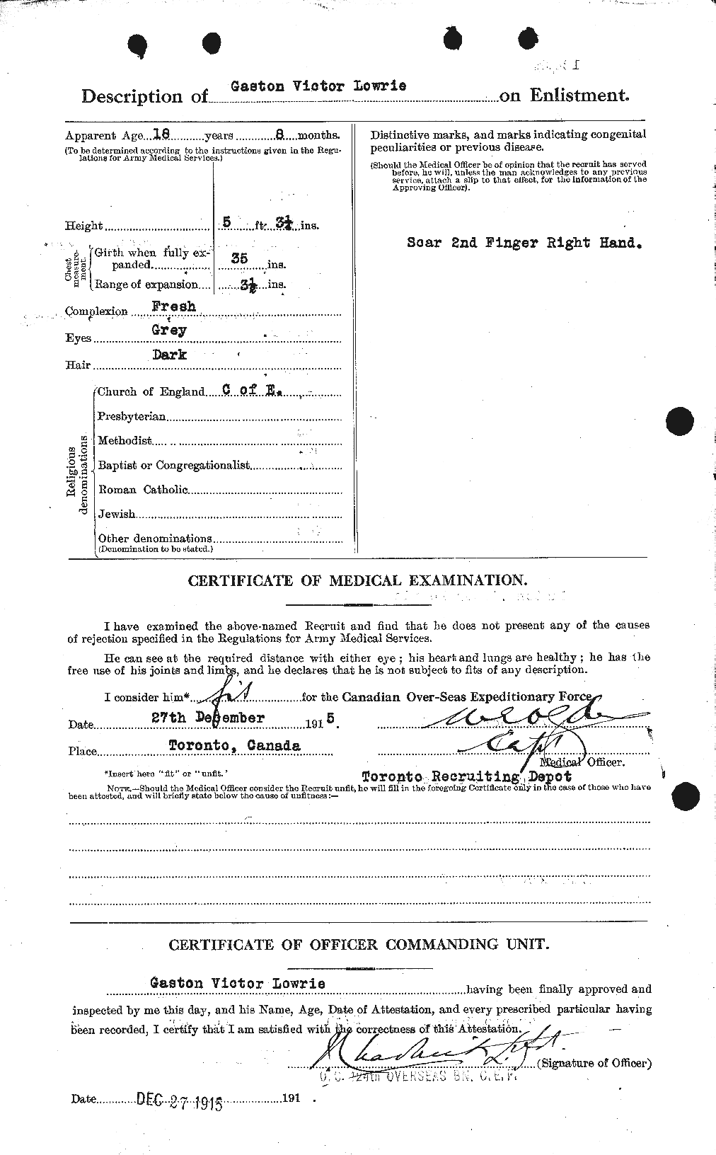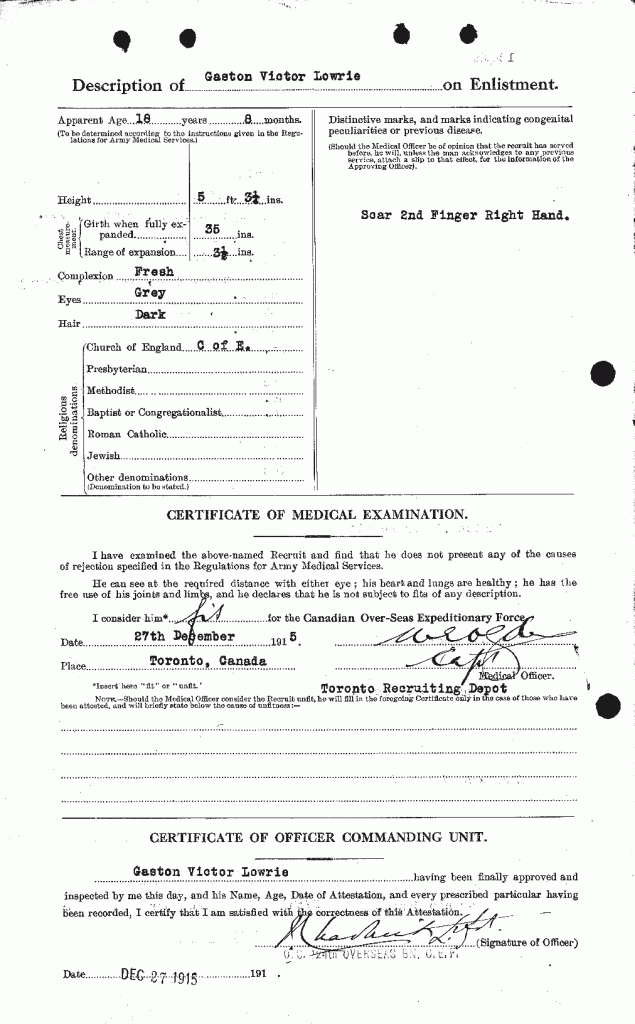 022053-27 Gaston Victor LAWRIE (Lowrie?), 28, advertising, Manchester England, Chicago U.S.A., s/o Frederick LAWRIE (b. England) & Dorothy DesLANGE married Dorothy Mary Walker FALLEN, 24, Galt, Galt, d/o Wellington FALLEN (b. Ontario) & Isabel APPLEYARD, witn: G. R. McQUEEN & Margaret McGREGOR both of Galt, 16 July 1927 in Galt.