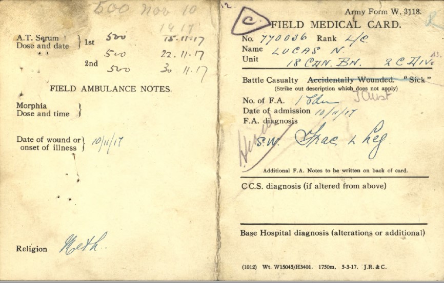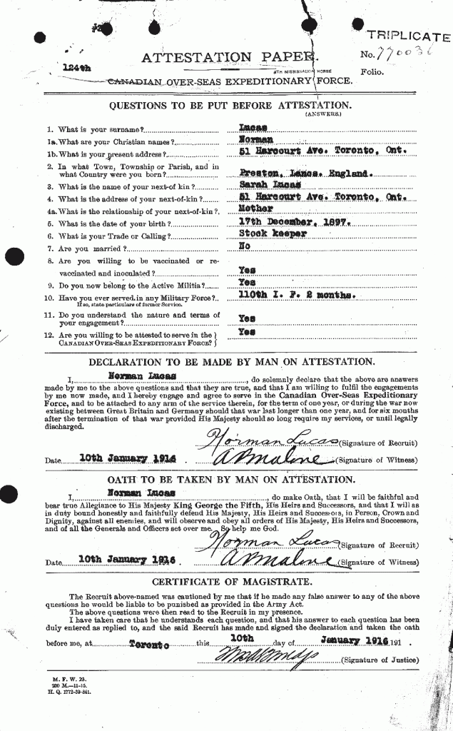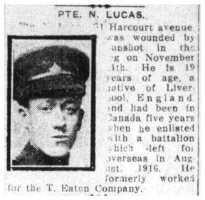 Lucas, Norman: Service no. 770036 Digitized Service Record Source: Per news clipping post by David Archer at 18th Battalion Facebook Page (not group). Find-A-Grave Lucas, Norman: Service no. 770036. Source: Toronto Telegram. November 1917. Per news clipping post by David Archer at 18th Battalion Facebook Page (not group). Share this: Click to email a link to a friend (Opens in new window) Email Click to share on Facebook (Opens in new window) Facebook Click to share on X (Opens in new window) X Click to share on Reddit (Opens in new window) Reddit Click to share on LinkedIn (Opens in new window) LinkedIn Click to print (Opens in new window) Print Click to share on Tumblr (Opens in new window) Tumblr Click to share on Pocket (Opens in new window) Pocket Click to share on Pinterest (Opens in new window) Pinterest Click to share on Telegram (Opens in new window) Telegram Click to share on WhatsApp (Opens in new window) WhatsApp Like Loading...