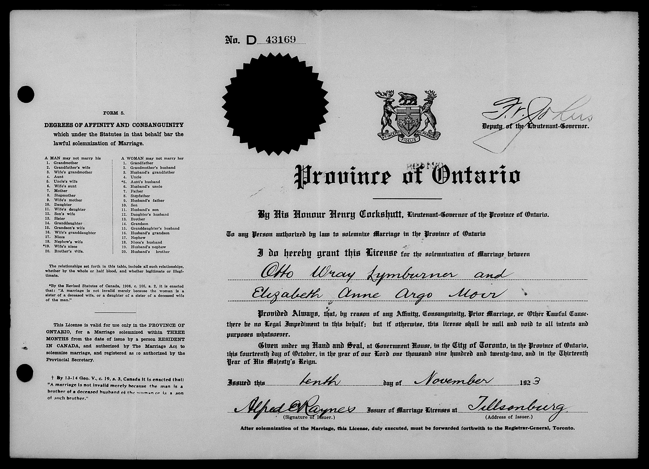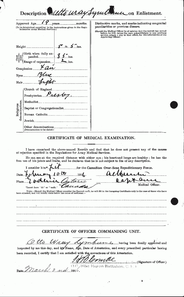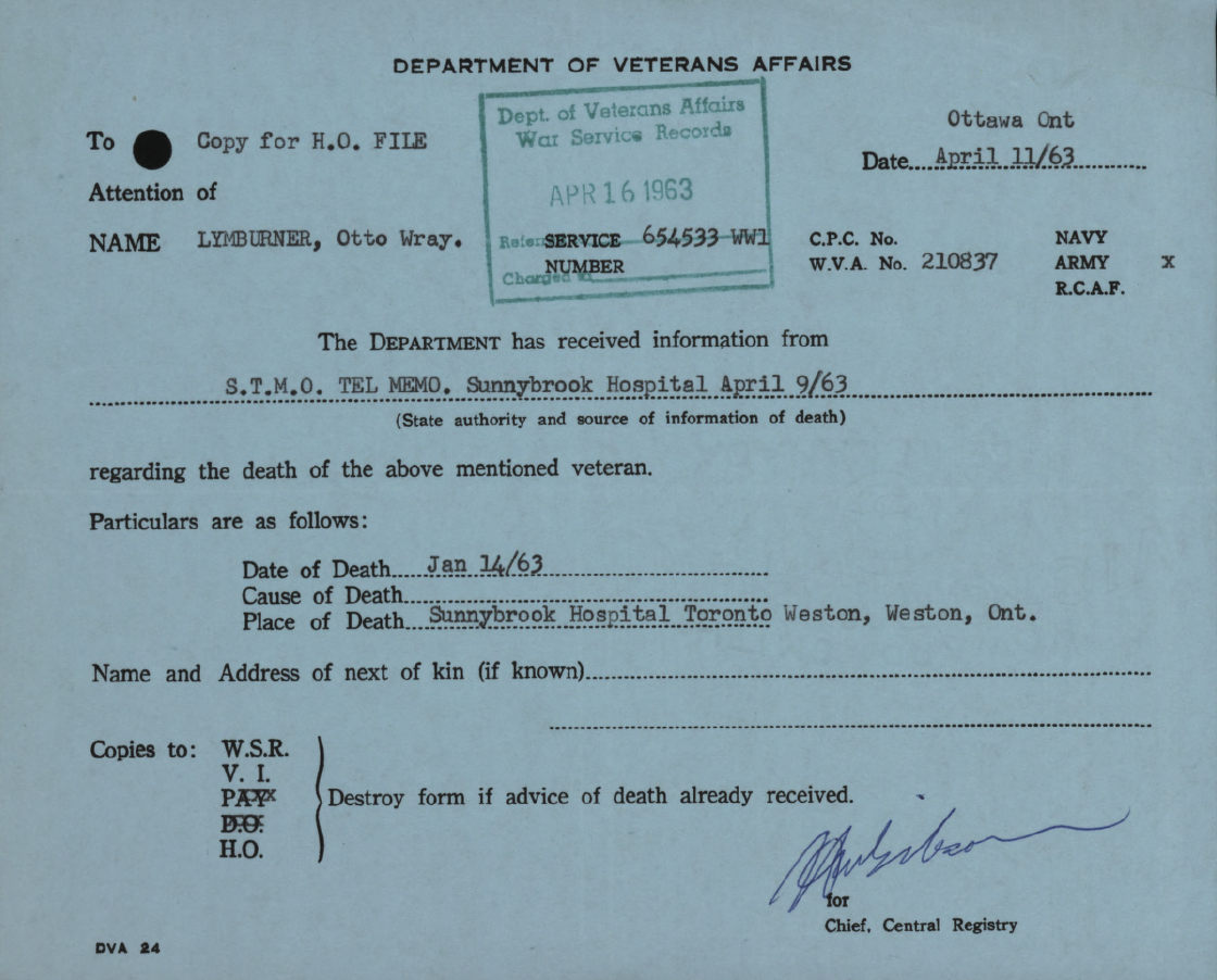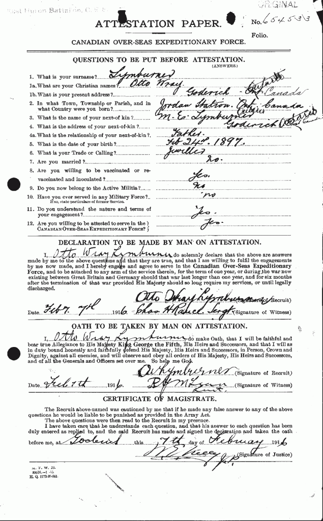Family Search: When Private Otto Wray Lymburner was born on 24 February 1897, in Lincoln, Niagara, Ontario, Canada, his father, Matthais Elmer Lymburner, was 31 and his mother, Mary Emily Vaughan, was 32. He married Elizabeth Anne Argo Moir on 10 November 1923, in Hamilton, Hamilton-Wentworth, Ontario, Canada. He lived in Huron, Ontario, Canada in 1911 and Wroxeter, Huron, Ontario, Canada in 1921. He registered for military service in 1916. In 1916, at the age of 19, his occupation is listed as jeweller in Goderich, Huron, Ontario, Canada. He died on 14 January 1963, in Toronto, Ontario, Canada, at the age of 65, and was buried in Tillsonburg Cemetery, Tillsonburg, Oxford, Ontario, Canada.
