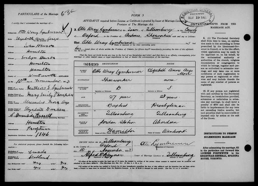 The family moved to Goderich between 1901 and 1911 where they were living when Otto enlisted for service there on February 7, 1916. He was a jeweller and not married. Otto returned from overseas on June 16, 1919, arriving in Halifax. By 1923 he was living in Tillsonburg working as a shoemaker, when he was married on November 10, 1923 in Hamilton to Elizabeth Anne Argo Moir (1900-1925), of Tillsonburg, the daughter of Alexander Argo Moir & Elizabeth Duncan.