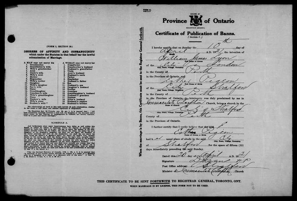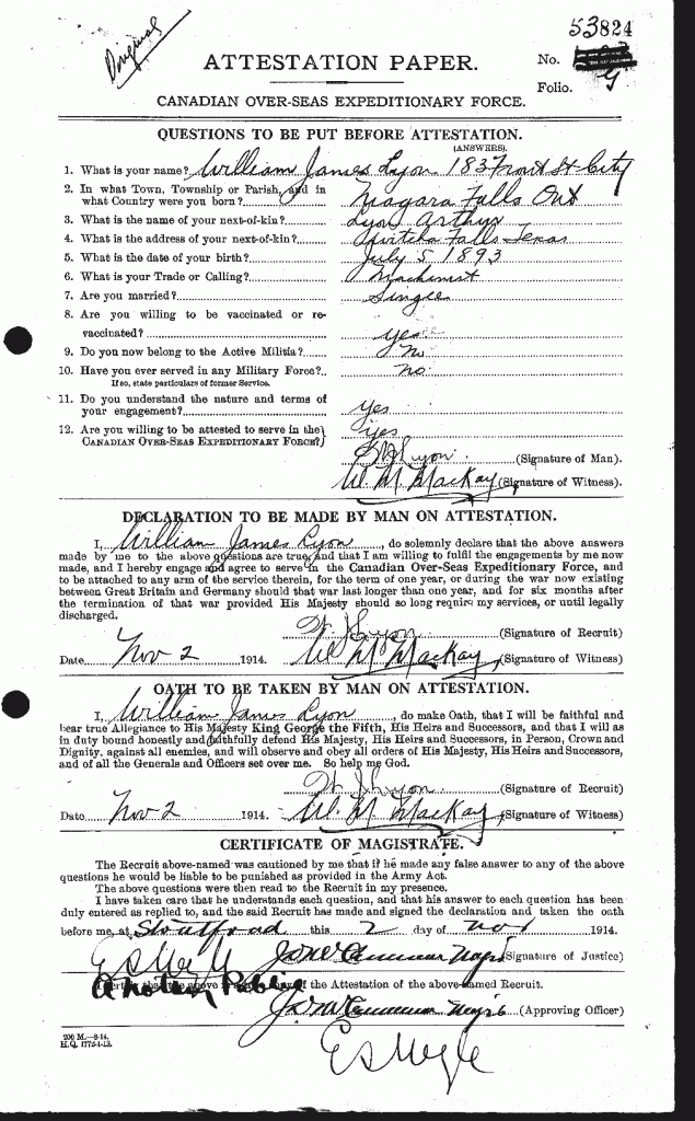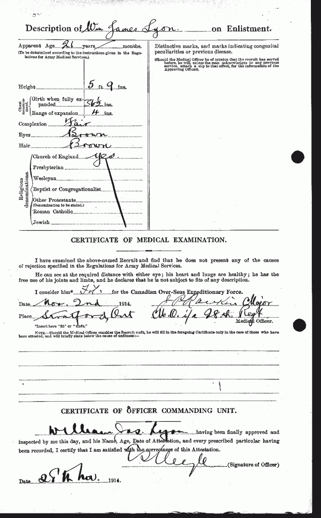 According to last night’s casualty list two members of the 18th Battalion are wounded: Private Wm. Lyon of Stratford and Private Maurice Heath of St. Thomas. The former is 22 years old, unmarried, and was employed in Stratford as a machinist. He was born in Niagara Falls, Ont., but his relatives live in Texas. In Stratford he lived at 183 Falstaff street. Private Maurice Heath joined the 18th at St. Thomas. Relatives live in England. Private Lorne Ross, of Detroit, a member of the 1st Battalion was killed in action.