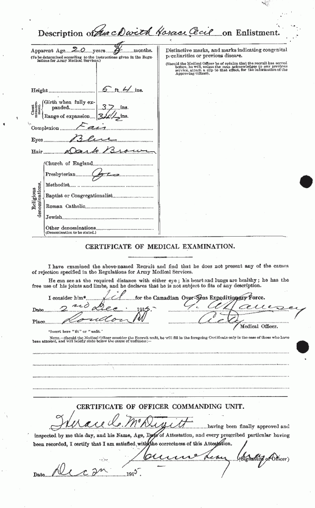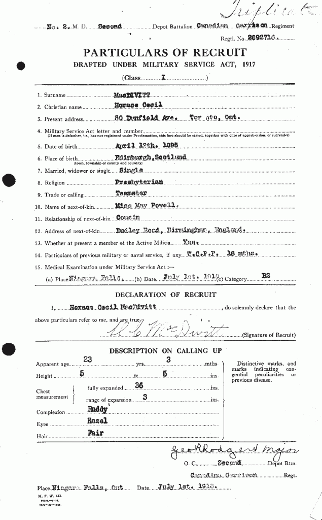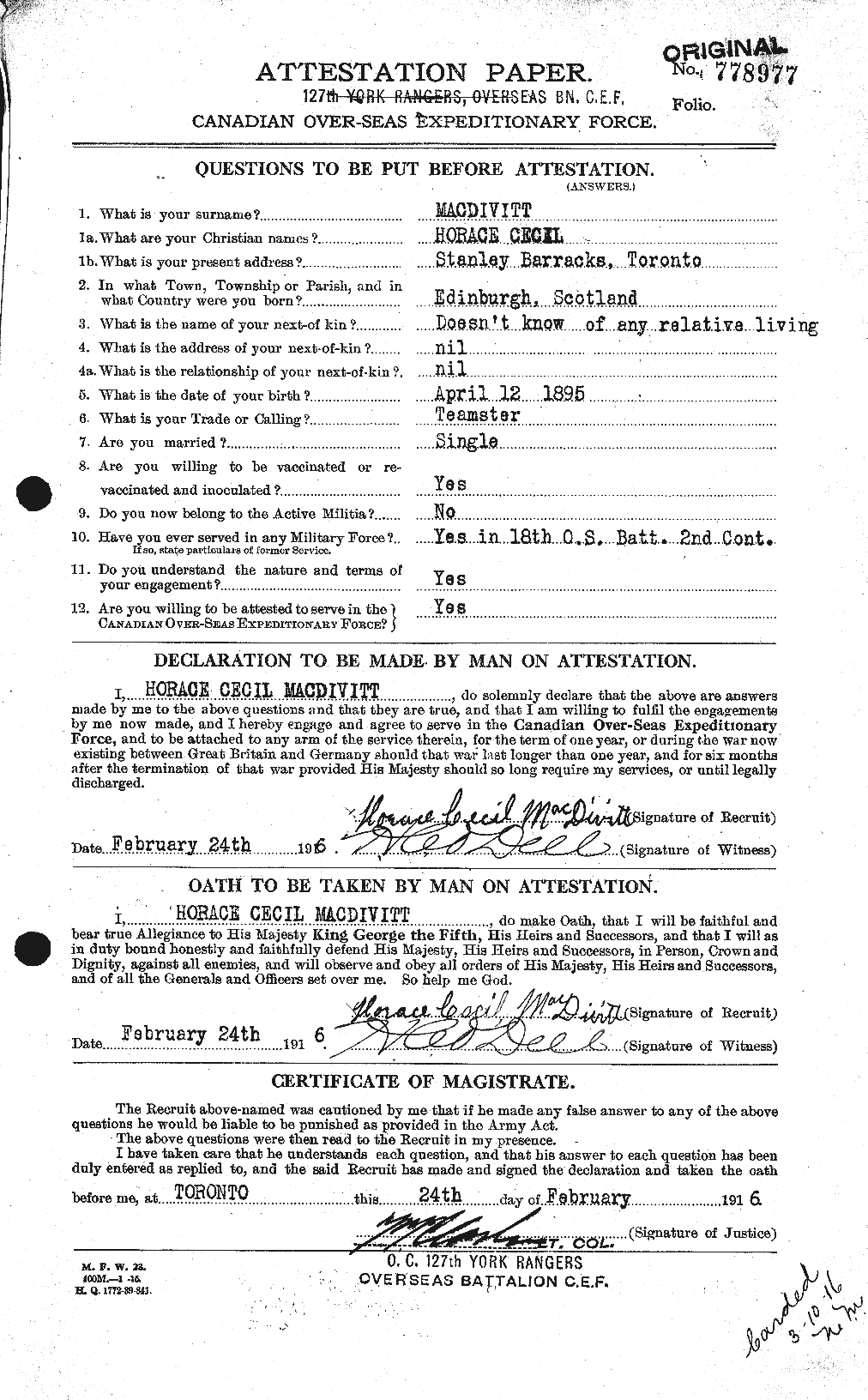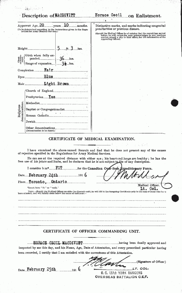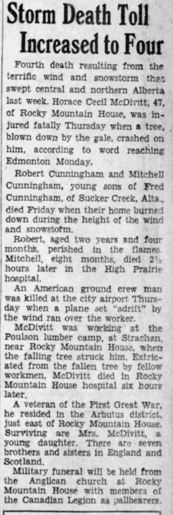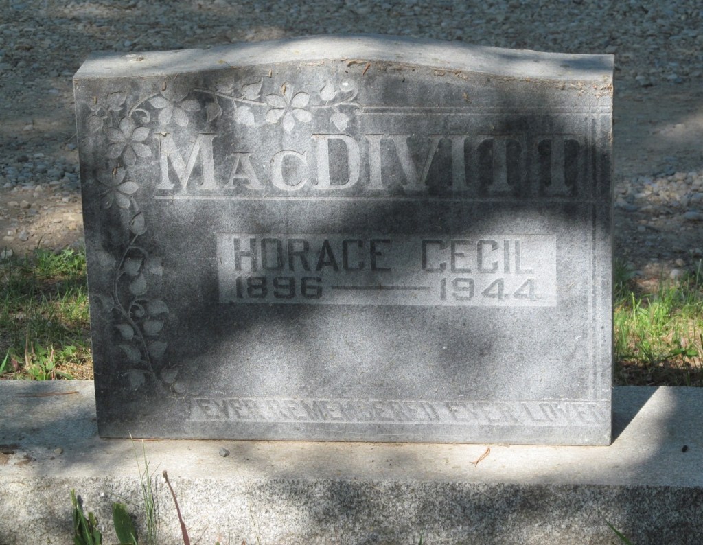 Family Search: When Private Horace Cecil MacDivitt was born on 26 April 1896, in Aston, Warwickshire, England, United Kingdom, his father, George Ernest MacDivitt, was 26 and his mother, Annie Maria SMITH, was 32. He married Beatrice Henson in 1924, in Birmingham, Warwickshire, England, United Kingdom. They were the parents of at least 1 daughter. He immigrated to Canada in 1904 and lived in Toronto, Ontario, Canada for about 3 years and Rocky Mountain House, Alberta, Canada in 1944. He registered for military service in 1914. He died on 23 February 1944, in Strachan, Clearwater County, Alberta, Canada, at the age of 47, and was buried in Pine Grove Cemetery, Rocky Mountain House, Clearwater 175, Alberta, Canada.