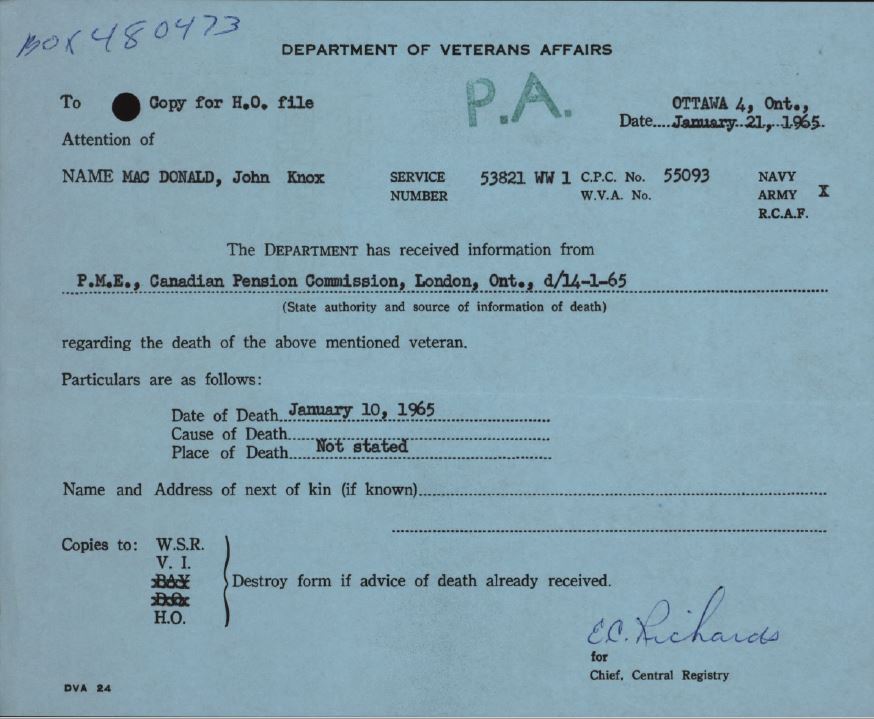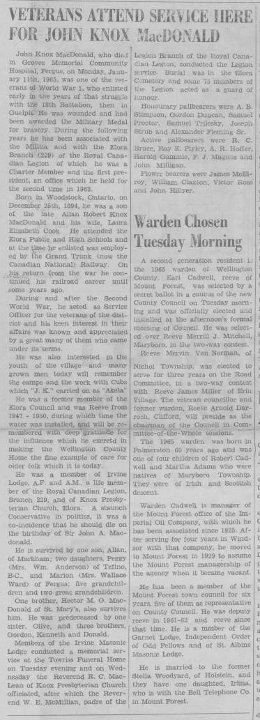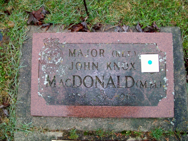 Family Search: When Major John Knox MacDonald was born on 25 December 1894, in Woodstock, Oxford, Ontario, Canada, his father, Alan Robert Knox MacDonald, was 38 and his mother, Lora Elizabeth Cook, was 27. He had at least 1 son and 4 daughters with Maud Victoria Newby. He lived in Wellington, Prince Edward, Ontario, Canada in 1911 and Elora, Wellington, Ontario, Canada in 1931. He registered for military service in 1914. In 1916, at the age of 22, his occupation is listed as signal man. He died on 10 January 1965, in Fergus, Wellington, Ontario, Canada, at the age of 70, and was buried in Elora Cemetery, Elora, Wellington, Ontario, Canada.