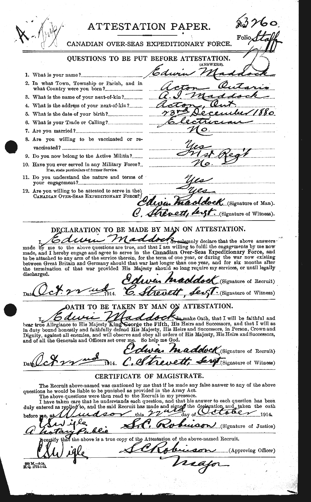 Family Search: When Edwin Graham Maddock was born on 28 December 1891, in Acton, Halton, Ontario, Canada, his father, Pitston Clarence Maddock, was 22 and his mother, Diana Isabella Matthews, was 20. He married Edyth Jane Wilson on 1 January 1915, in South Easthope Township, Perth, Ontario, Canada. He registered for military service in 1914. In 1914, at the age of 23, his occupation is listed as electrician. He died on 11 January 1985, in Victoria, British Columbia, Canada, at the age of 93, and was buried in Victoria, British Columbia, Canada.