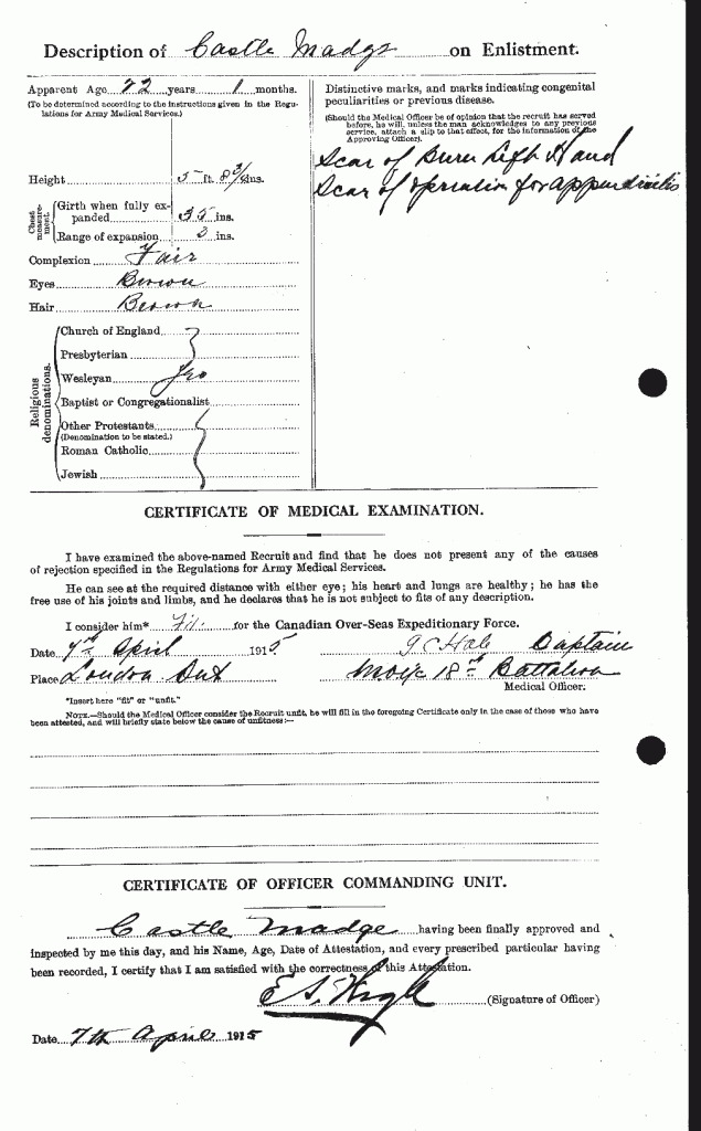 Family Search: Castle George Chas Madge was born on 13 March 1893, in London, Ontario, Canada as the son of William Madge and Nellie Castle. He married Minnie Lena Hill on 16 October 1918, in Windsor, Essex, Ontario, Canada. They were the parents of at least 1 daughter. He lived in Windsor, Sandwich, Essex, Ontario, Canada in 1921. He registered for military service in 1915. In 1914, at the age of 21, his occupation is listed as woodworker.