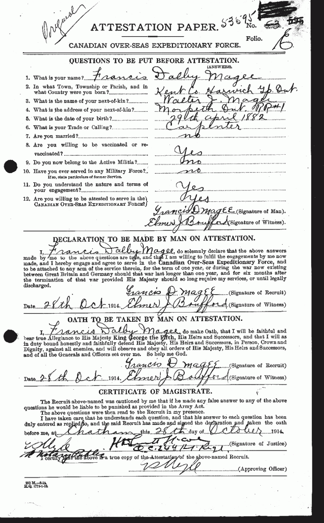 When Francis Dalby Magee was born on 27 April 1882, in Harwich, Kent, Ontario, Canada, his father, James Magee, was 47 and his mother, Agnes Johnson, was 39. He lived in Kent, Ontario, Canada in 1901 and Morpeth, Chatham-Kent, Ontario, Canada in 1921. He registered for military service in 1914. In 1914, at the age of 32, his occupation is listed as carpente. He died on 17 July 1950, in Chatham, Chatham-Kent, Ontario, Canada, at the age of 68, and was buried in Morpeth Cemetery, Morpeth, Chatham-Kent, Ontario, Canada.MORE