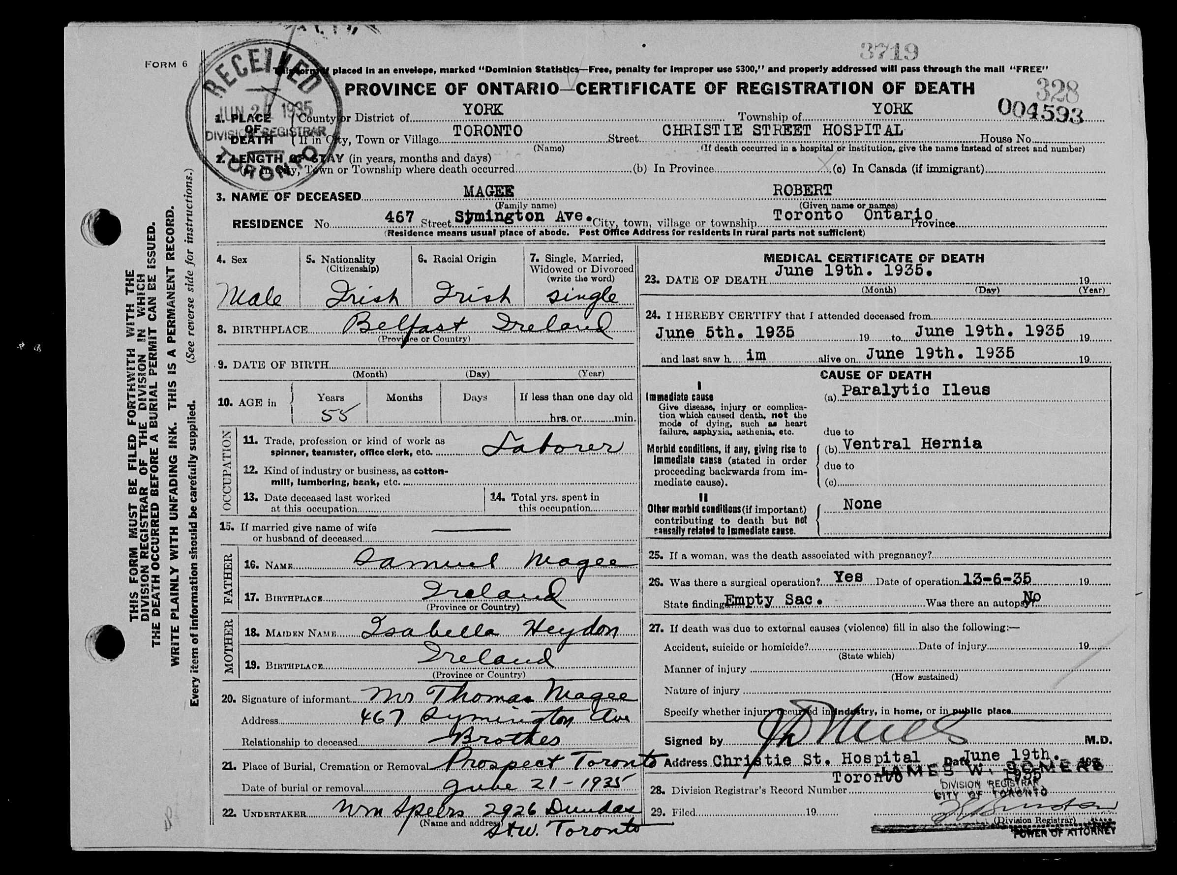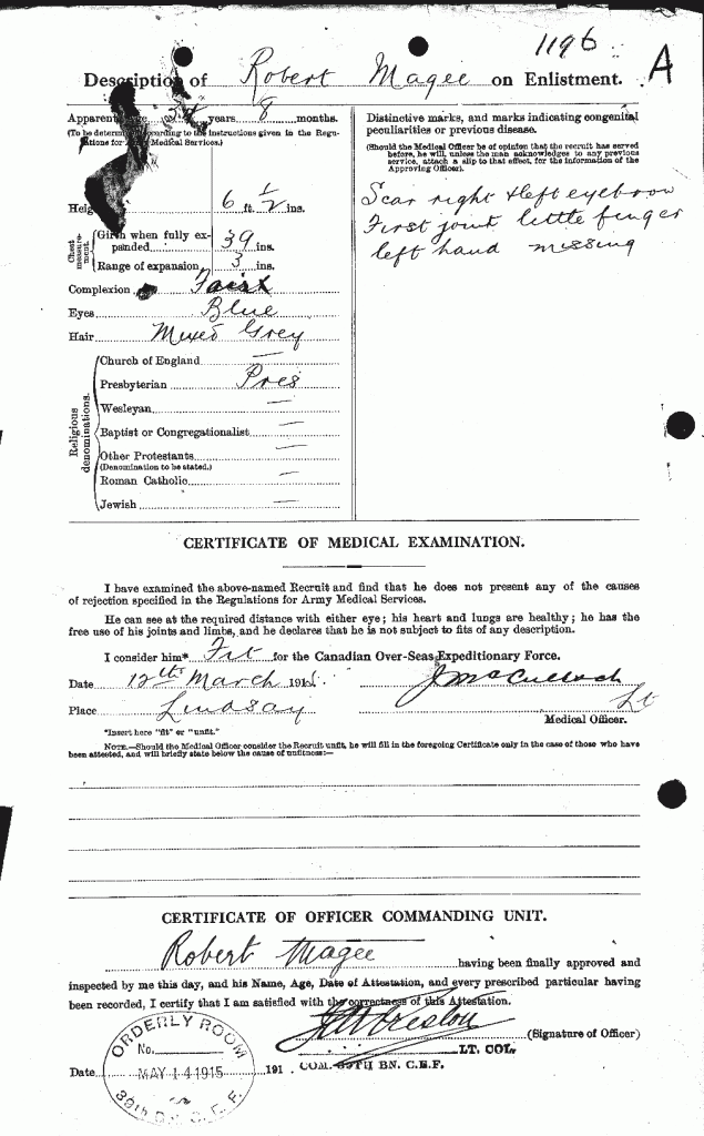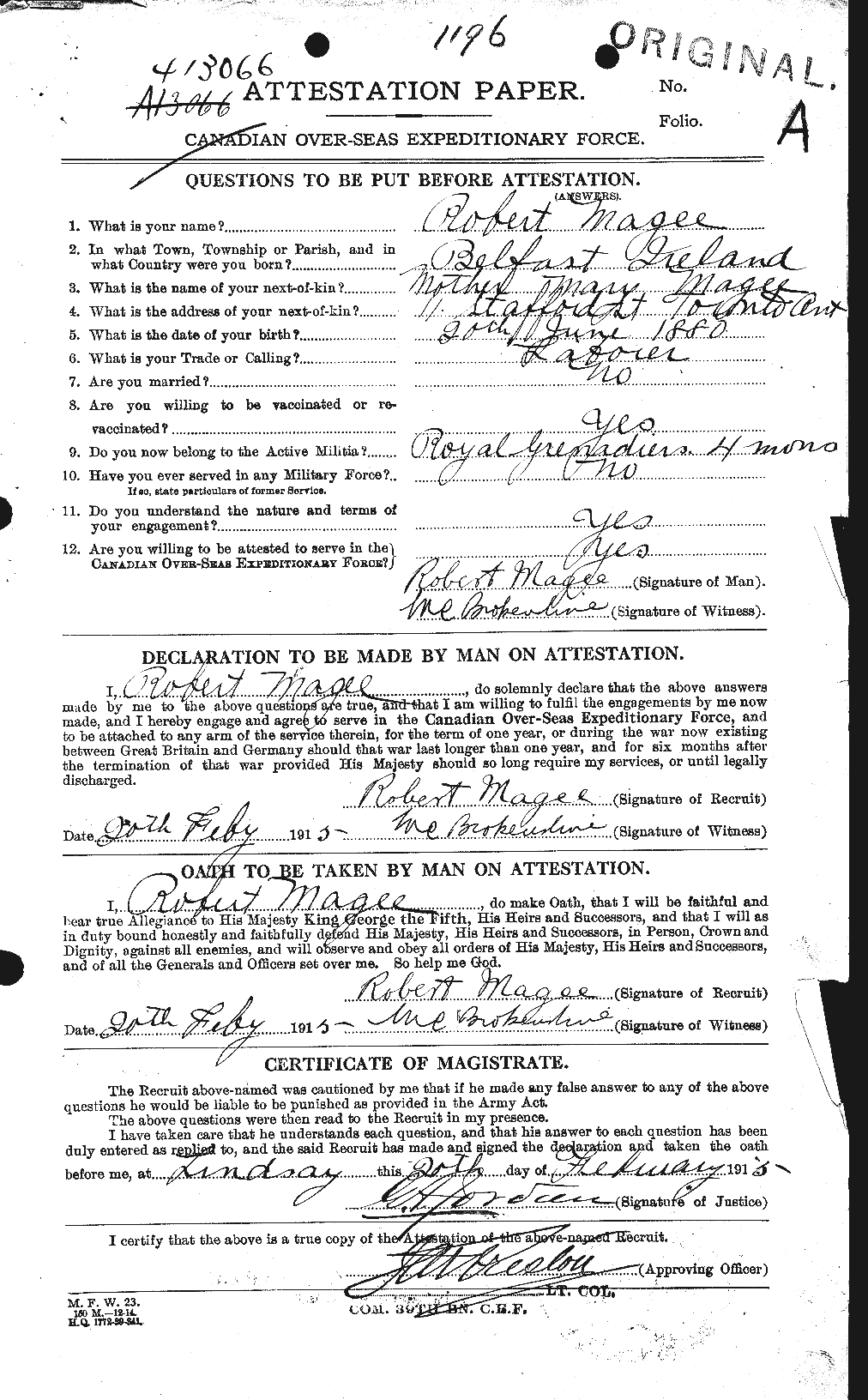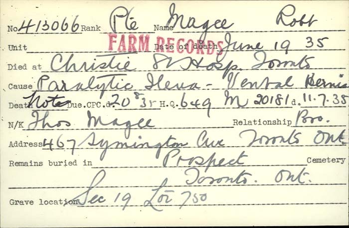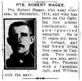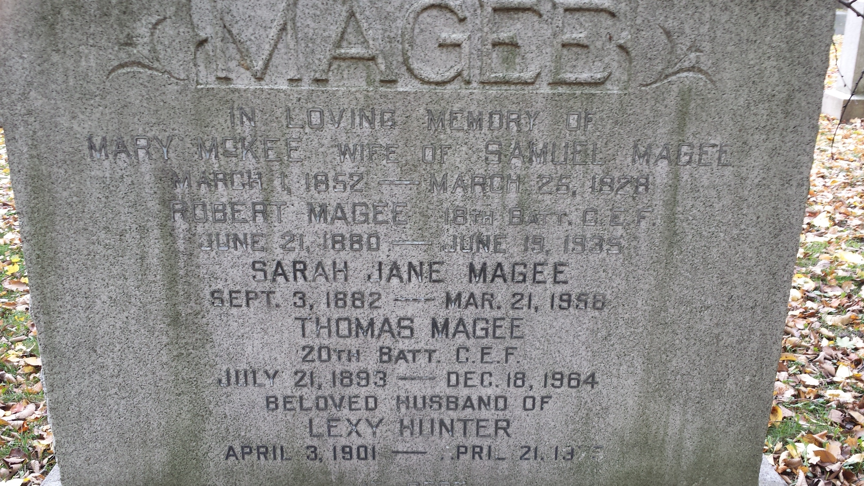 Family Search: When Private Robert Magee was born on 20 June 1880, in Belfast, Ireland, his father, Samuel Magee, was 32 and his mother, Isabella Hayden, was 31. He immigrated to Canada in 1913 and lived in Legoniel, Shankill, County Antrim, Ireland in 1911 and Toronto, York, Ontario, Canada in 1921. He registered for military service in 1915. In 1915, at the age of 35, his occupation is listed as labourer. He died on 19 June 1935, in Toronto, Ontario, Canada, at the age of 54, and was buried in Prospect Cemetery, Toronto, Ontario, Canada.