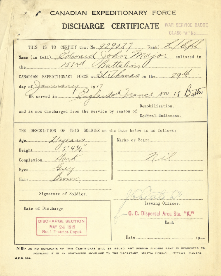 Trade listed as Farmer. DOB 22-2-98, born Plymouth, England. 5 foot 4 3/4 inches. Grey eyes, brown hair. Catholic. Edward Major, father. NOK Vera Olive Major, wife. Enlisted St Thomas 29-1-17 (age 18 years 1 month). On 153rd Battalion Nominal Roll 2-2-17, no transfer noted. Embarked with 153rd Halifax N.S. SS Olympic 29-4-17. Taken on Strength 18th Battalion 19-8-18. Shrapnel wound right hand, left knee, left leg 13-10-18. Returned to Canada aboard SS Caronia, 22-5-19, Halifax, N.S. Demobilized London 24-5-19. Ontario Marriage Registry (007892) married 28-3-17 to Vera Olive Pound at St Thomas, his occupation listed as soldier.