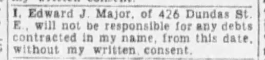 MAJOR, Edward John—At Sunnybrook Hospital on Wednesday, April 13, 1966. Edward John Major of 426 Dundas St. E. (18th Battalion World War I, Canadian Pay Corps, World War II), father of John of Cleveland and Marion (Mrs. Kilmer) of St. Thomas. Dear friend of Mr. and Mrs. E. Deering. Mr. Major is resting at the “Danforth Chapel” of McDougall & Brown Ltd., 1491 Danforth Ave. (enter parking area from Parkmount Rd.). Requiem Mass in St. Paul’s Church, 83 Power St., 10 a.m. Friday. Interment Mount Hope Cemetery.