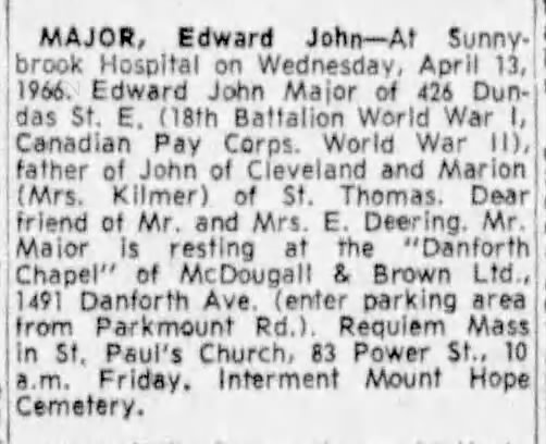 MAJOR, Edward John—At Sunnybrook Hospital on Wednesday, April 13, 1966. Edward John Major of 426 Dundas St. E. (18th Battalion World War I, Canadian Pay Corps, World War II), father of John of Cleveland and Marion (Mrs. Kilmer) of St. Thomas. Dear friend of Mr. and Mrs. E. Deering. Mr. Major is resting at the “Danforth Chapel” of McDougall & Brown Ltd., 1491 Danforth Ave. (enter parking area from Parkmount Rd.). Requiem Mass in St. Paul’s Church, 83 Power St., 10 a.m. Friday. Interment Mount Hope Cemetery.
