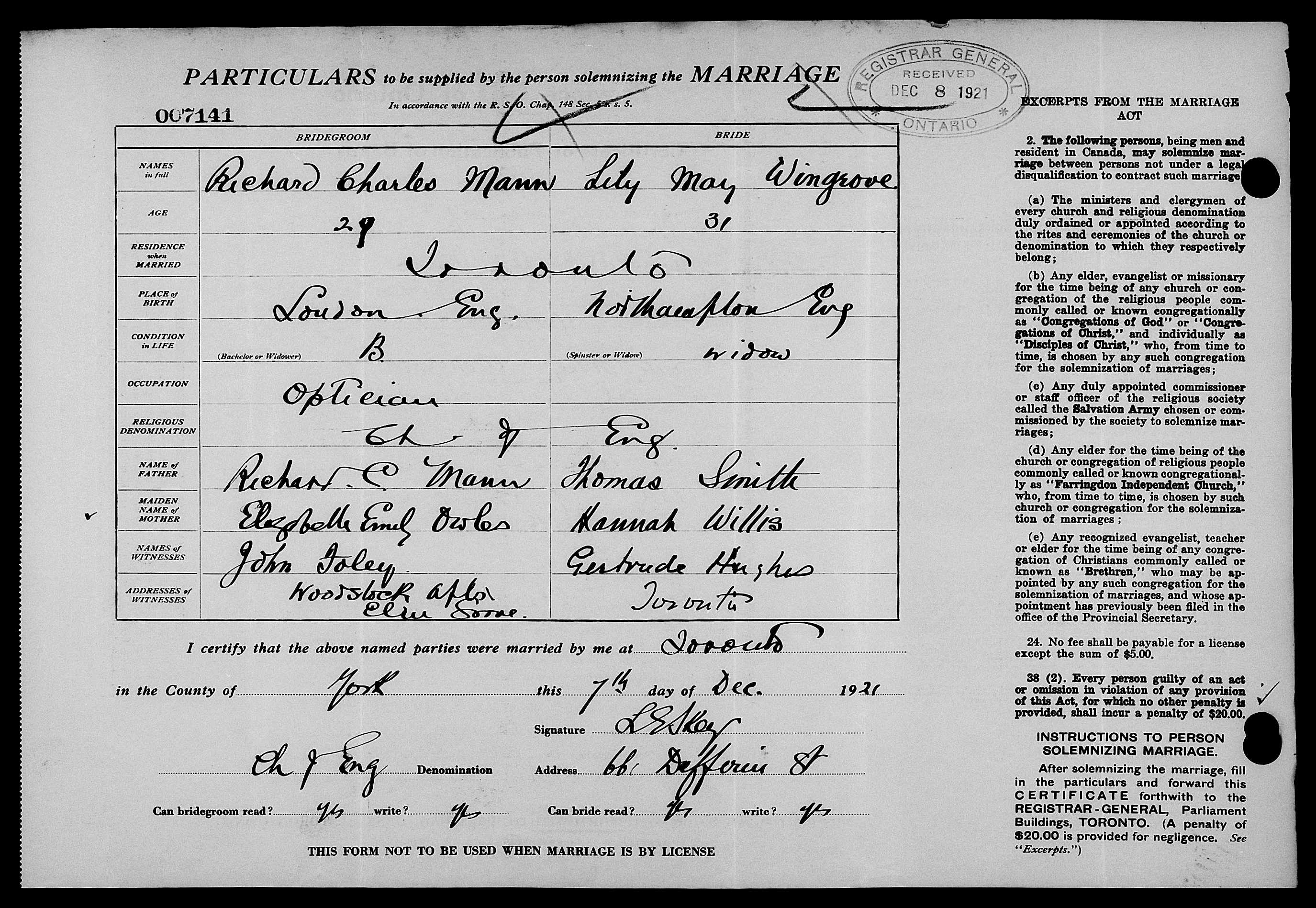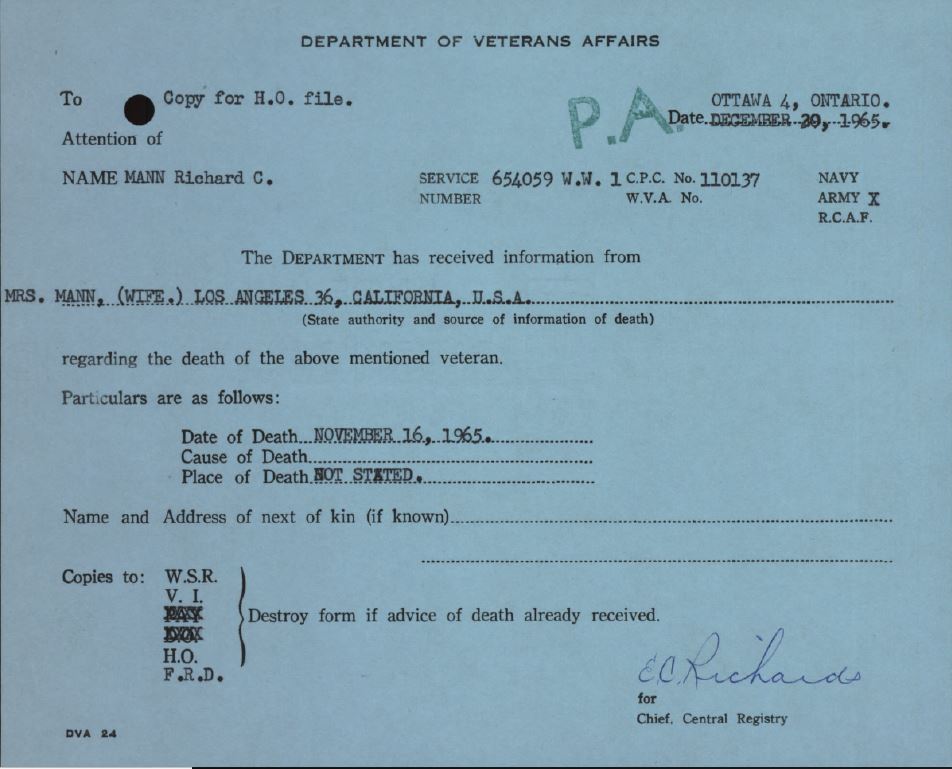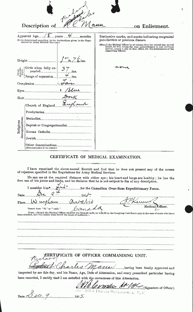 654059, MANN, (Sgt.) Richard Charles, “A” Company enlisted in Wingham on December 9, 1915, where he was employed as a glove cutter for Gurvey’s Gloveworks [Gurney Glove Works] prior to the outbreak of WWI. Richard Charles Mann was born on August 19, 1894 in London, England and he went back to England with the 161stHuron Battalion. His next of kin was his father, Richard Charles Mann of Wingham, ON. Dick Mann stood 5’ 7.5” and had a fair complexion, blue eyes and dark hair. He was Church of England in faith.