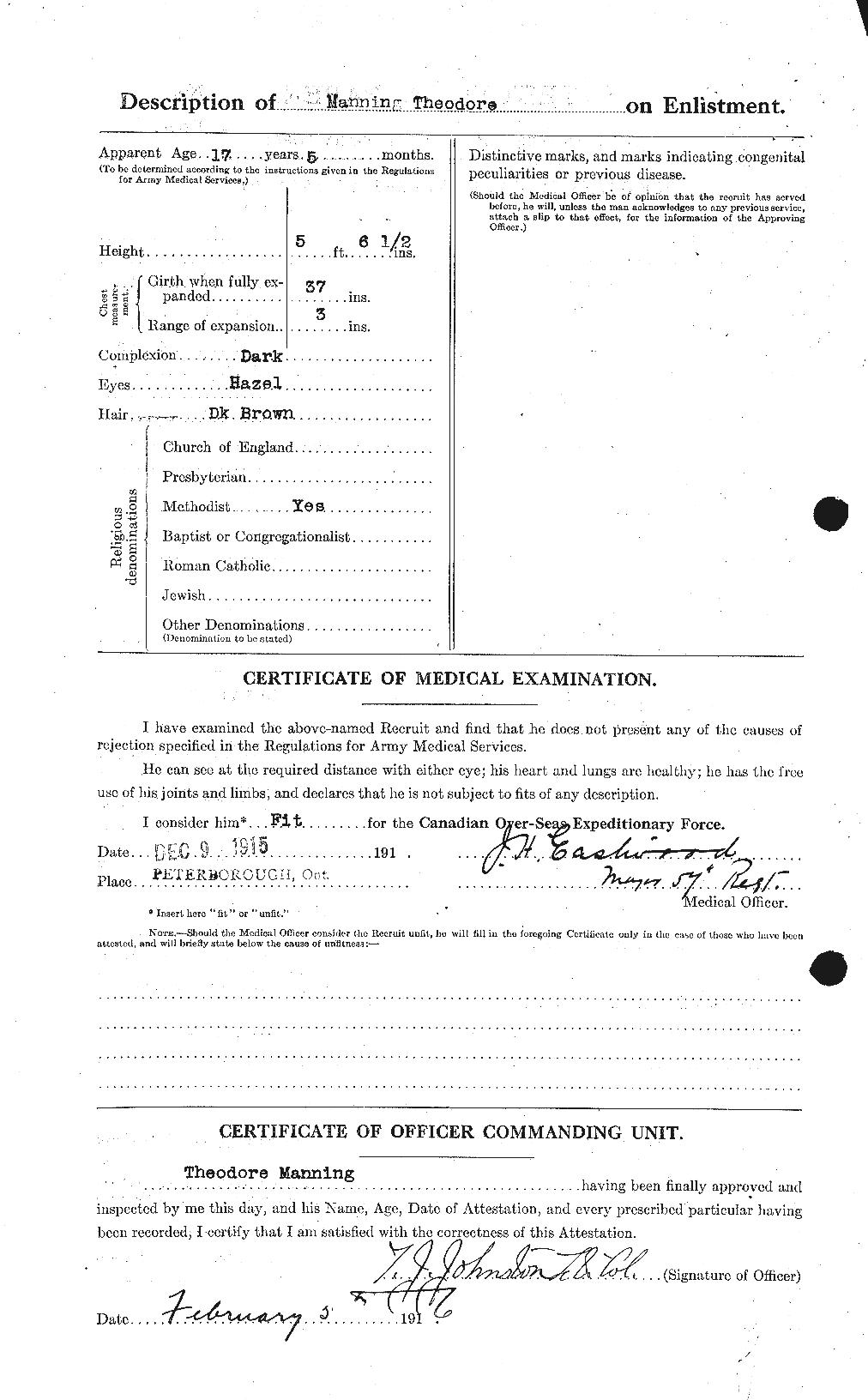 Private Theodore Manning served for about 7 months and 18 days in Canada; 2 months and 27 days in the United Kingdom; 2 years, 5 months and 22 days in France and 20 days Travel Time for a total time of about 3 years, 4 months and 12 days.